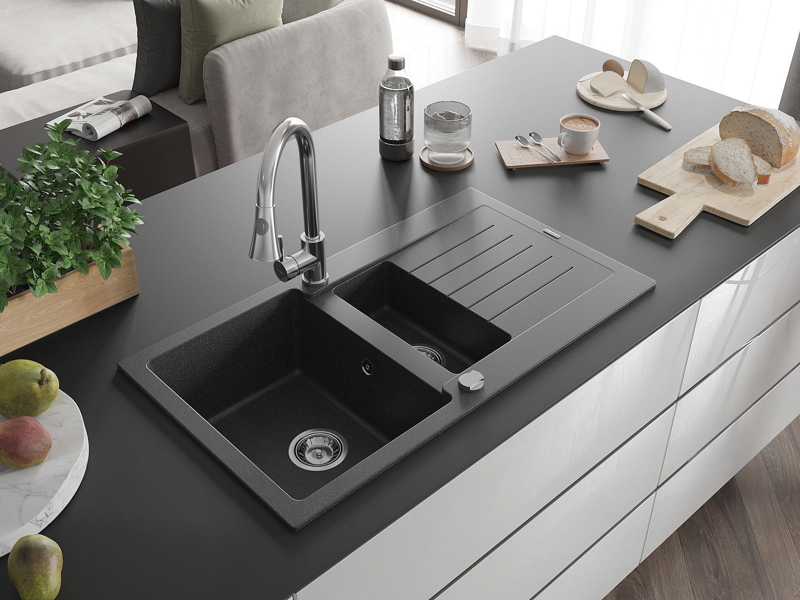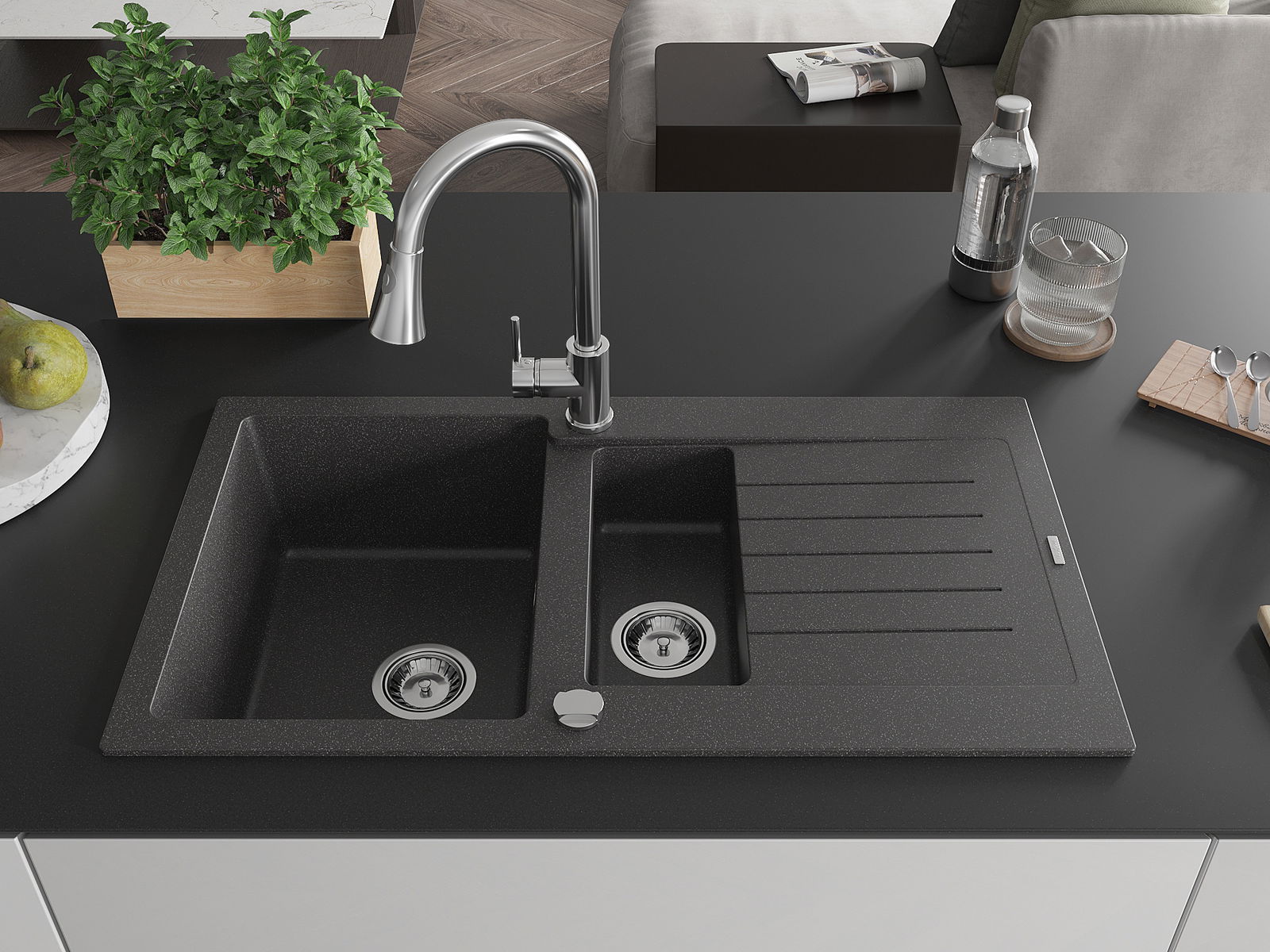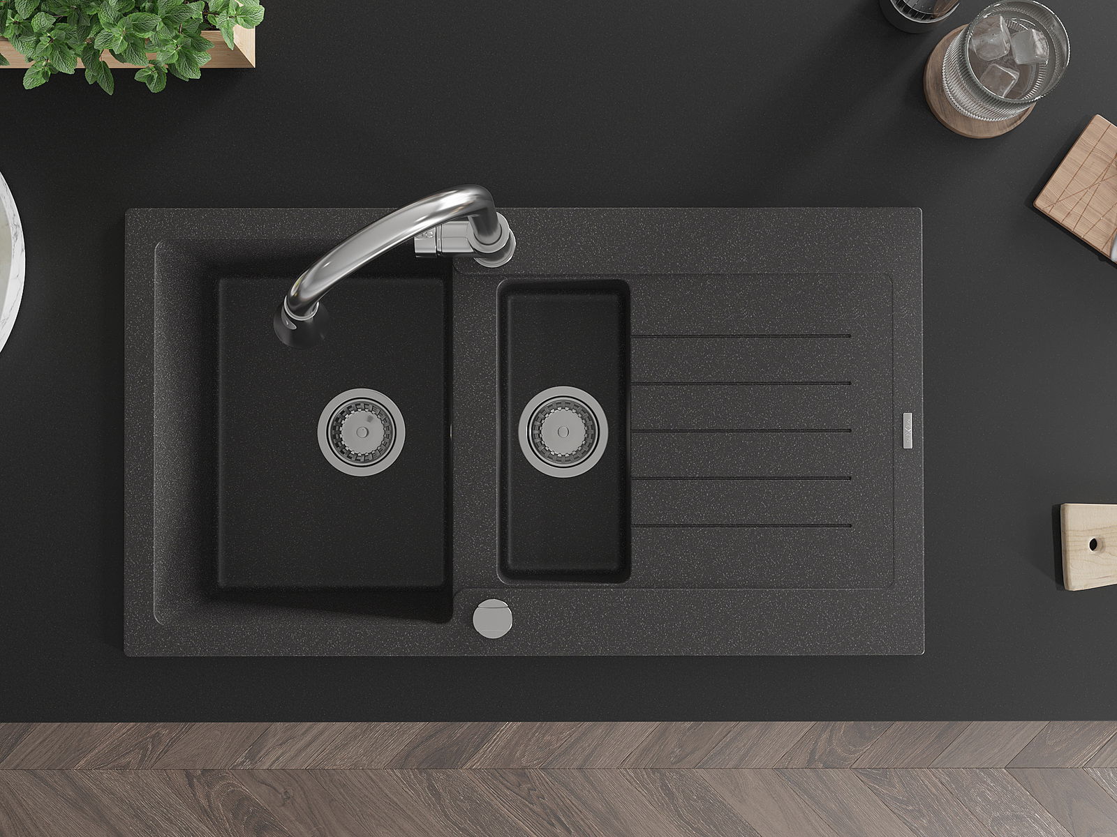 A mosogató kiváló minőségű gránitból készül. Ez egy elegáns és mindenekelőtt minden konyhához praktikus kiegészítés, stílusától függetlenül. A kiváló minőségű és a gránit tartósság biztosítja a sok éves használatát.