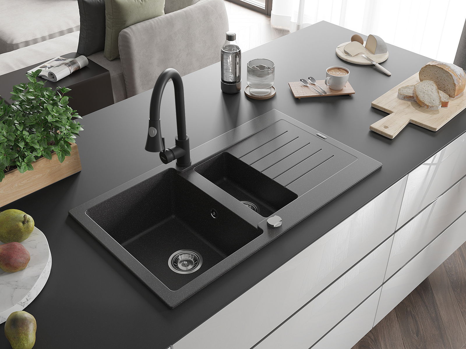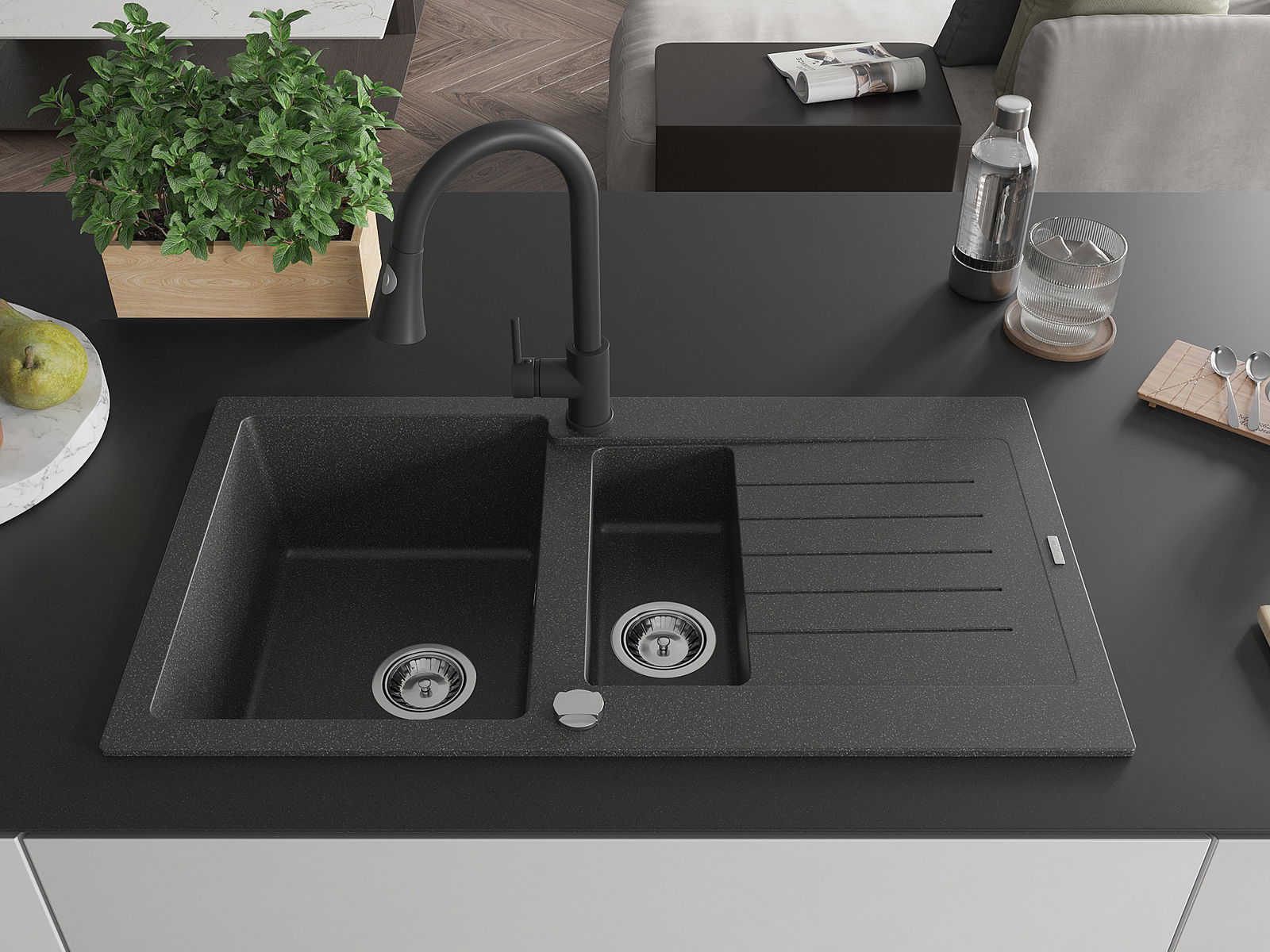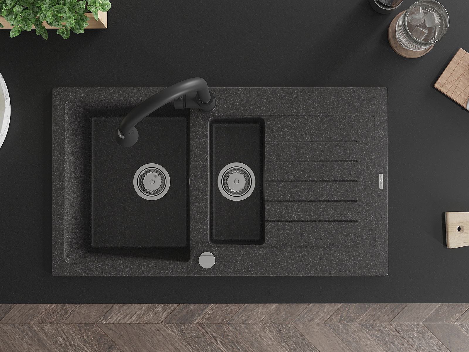 A mosogató magas minőségű gránitból készült. Elegáns, de mindenekelőtt praktikus kiegészítője minden konyhának, függetlenül annak stílusától. A gránit magas minősége és tartóssága hosszú távú használatot biztosít.