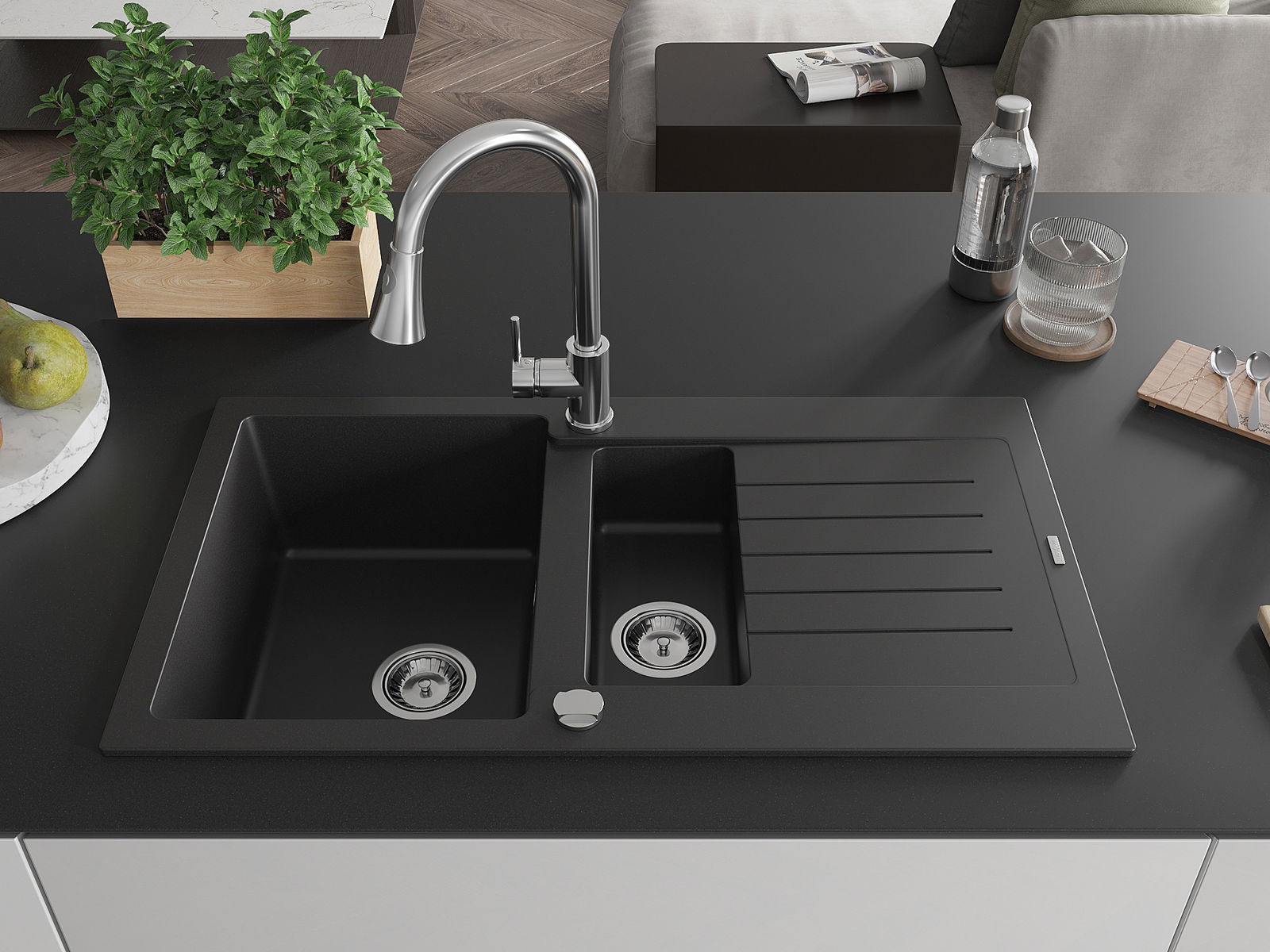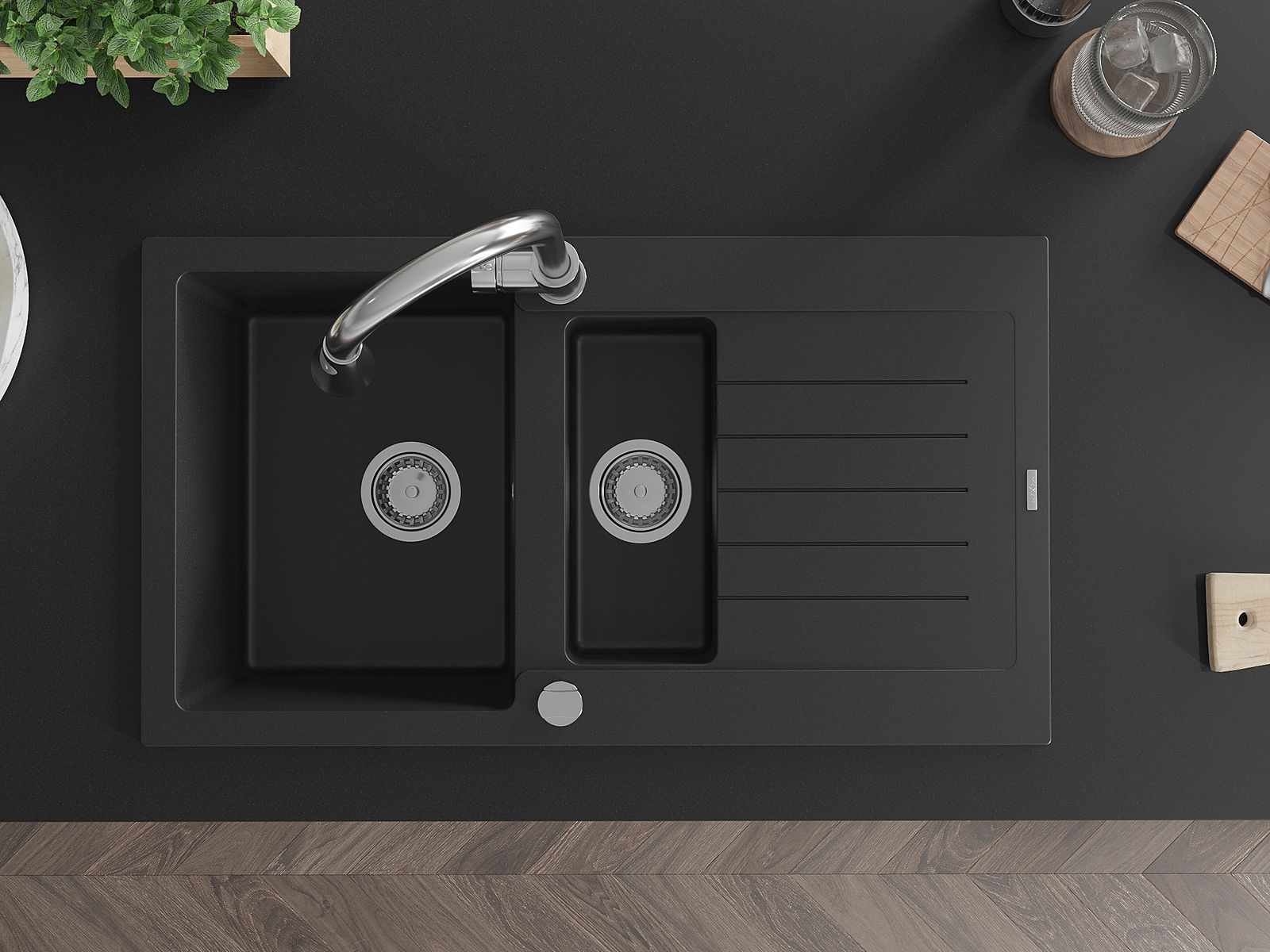 Mexen Matias gránit mosogató 1,5 rekeszes csepptálcával és Elia konyhai csappal, fekete - 6502-77-670101-00