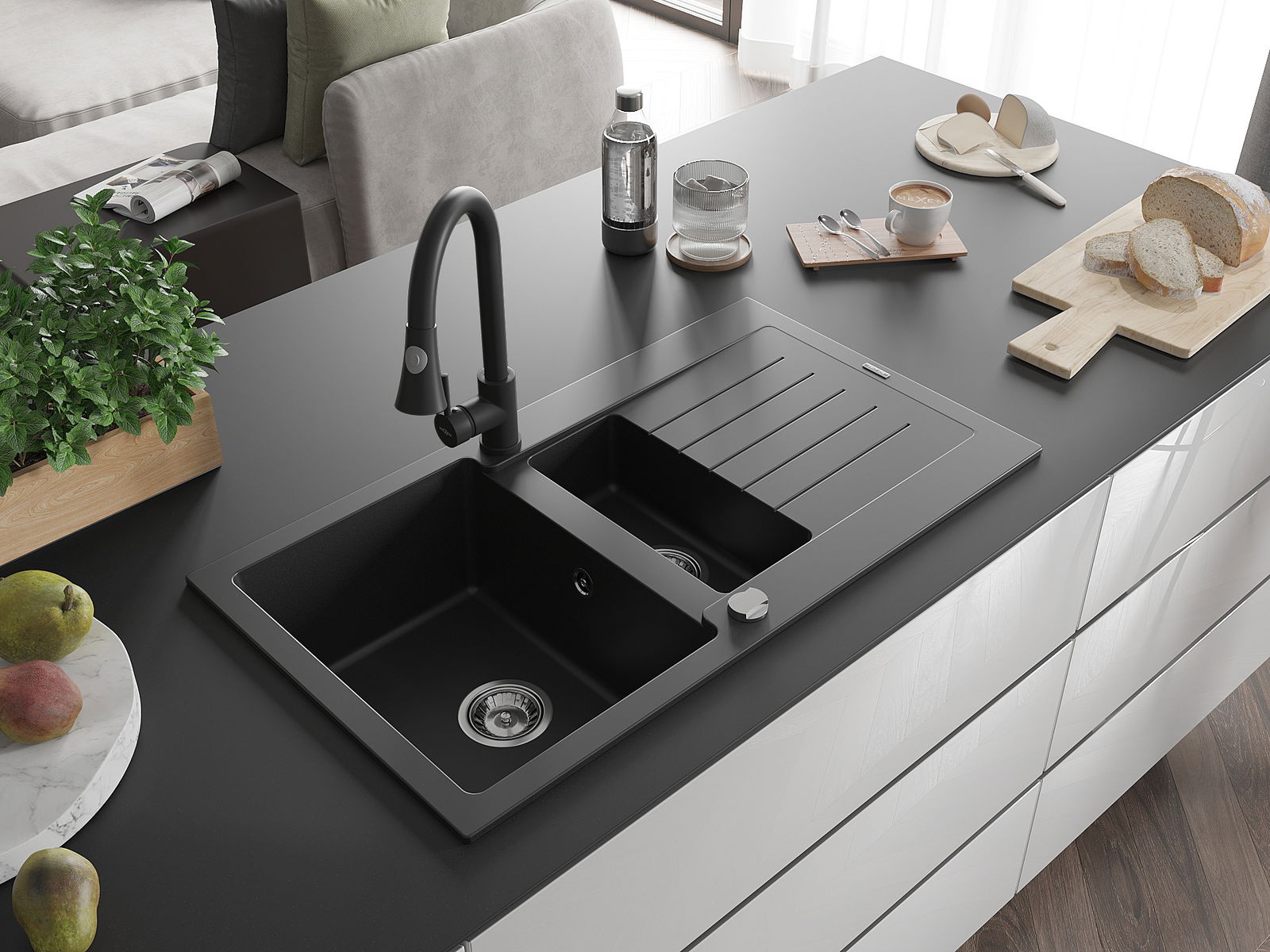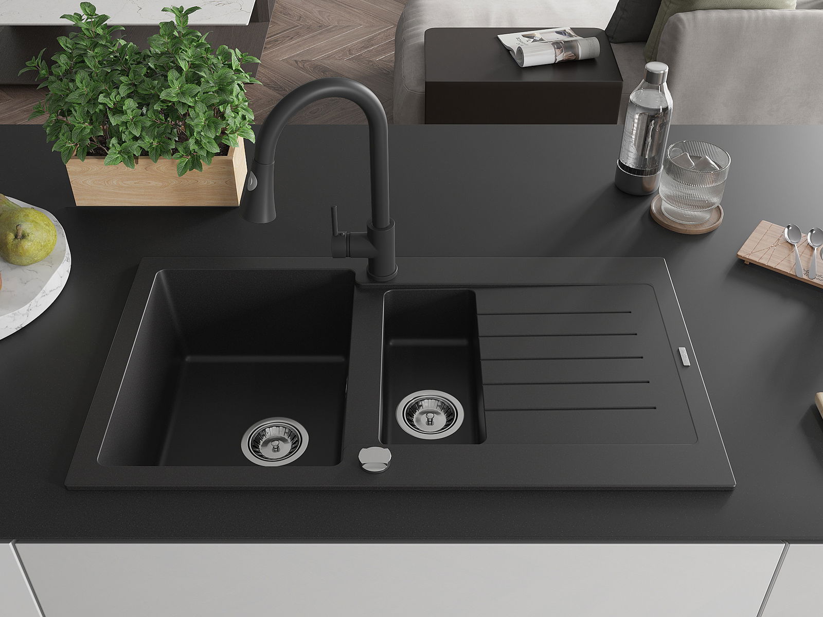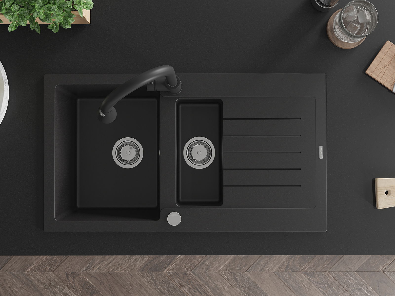 Mexen Matias 1,5 rekeszes gránit mosogató csepegtetővel és Elia konyhai csappal, fekete - 6502-77-670101-70