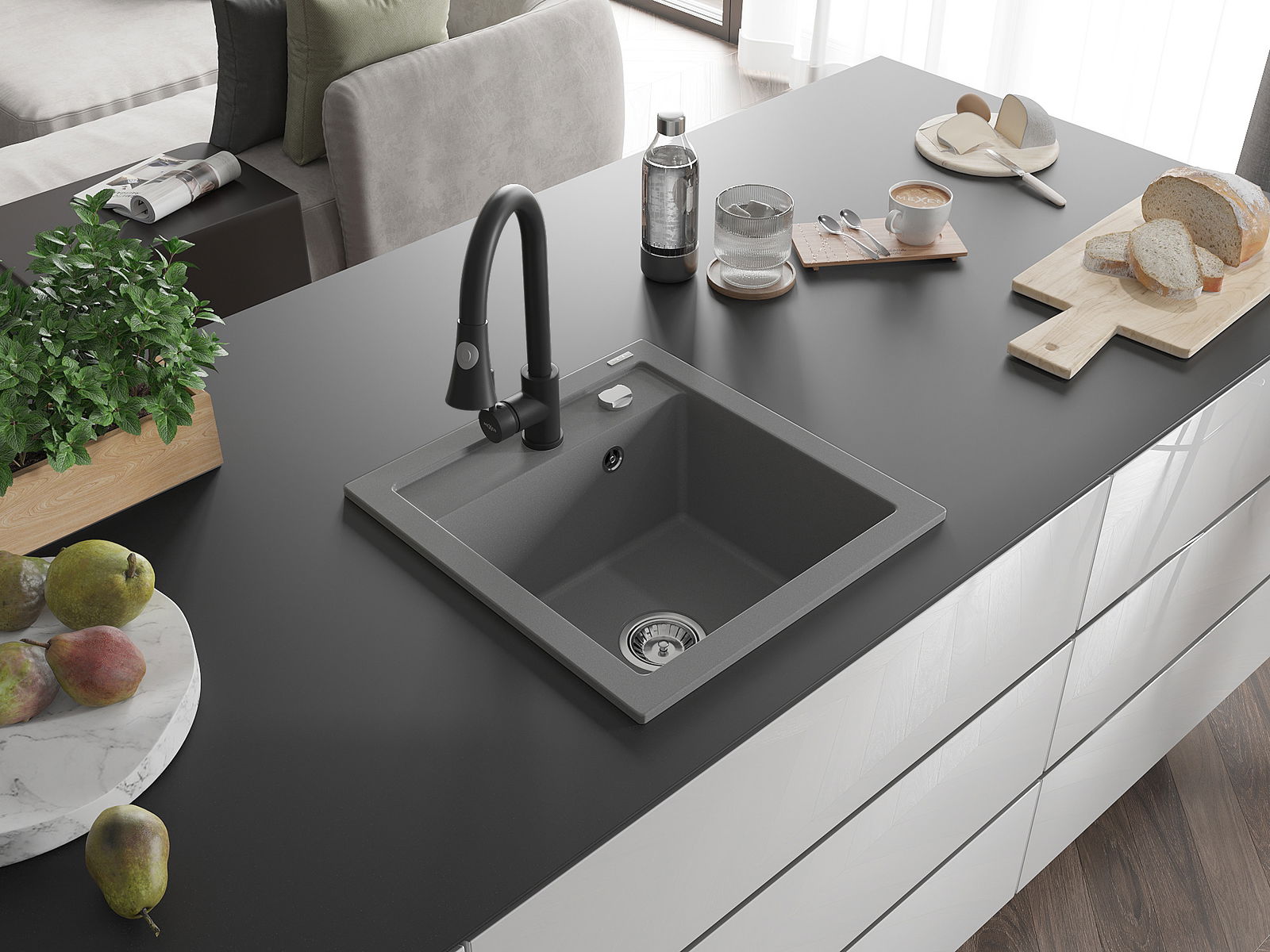 A mosogató kiváló minőségű gránitból készül. Ez egy elegáns és mindenekelőtt minden konyhához praktikus kiegészítés, stílusától függetlenül. A kiváló minőségű és a gránit tartósság biztosítja a sok éves használatát.