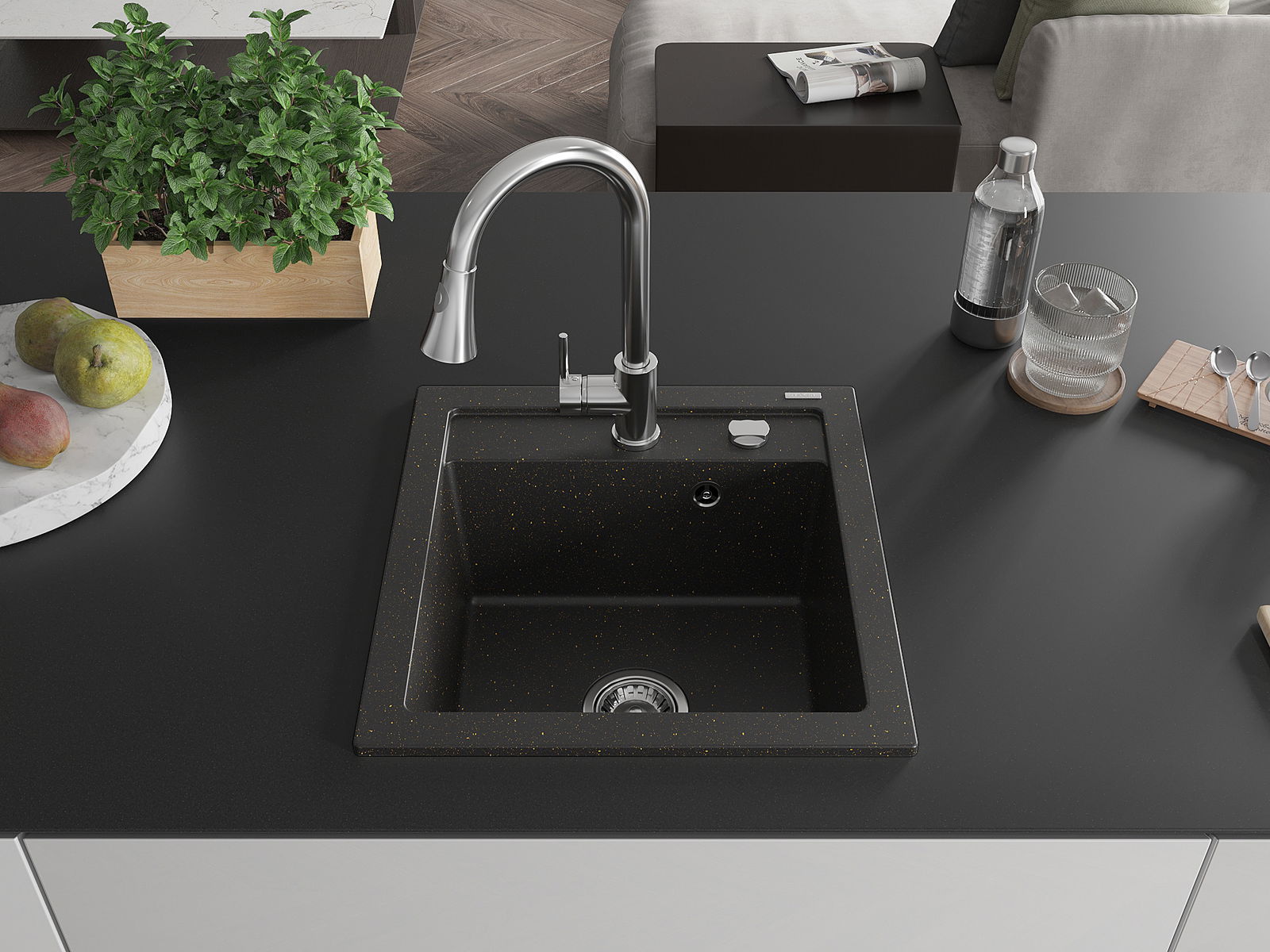 Mexen Vito 1 rekeszes gránit mosogató Elia konyhai csapteleppel, fekete/arany metál - 6503-75-670101-00