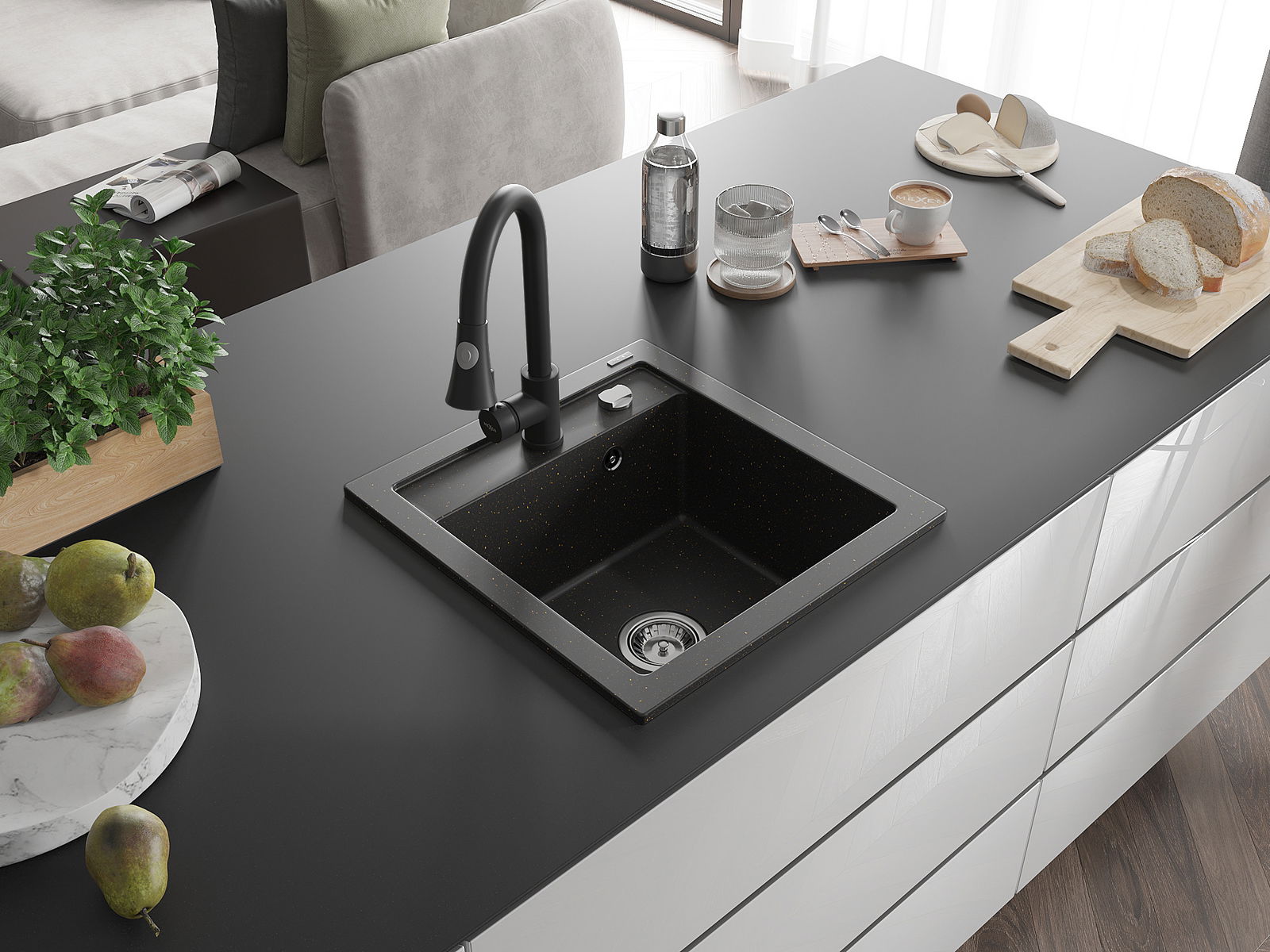 A mosogató kiváló minőségű gránitból készül. Ez egy elegáns és mindenekelőtt minden konyhához praktikus kiegészítés, stílusától függetlenül. A kiváló minőségű és a gránit tartósság biztosítja a sok éves használatát.