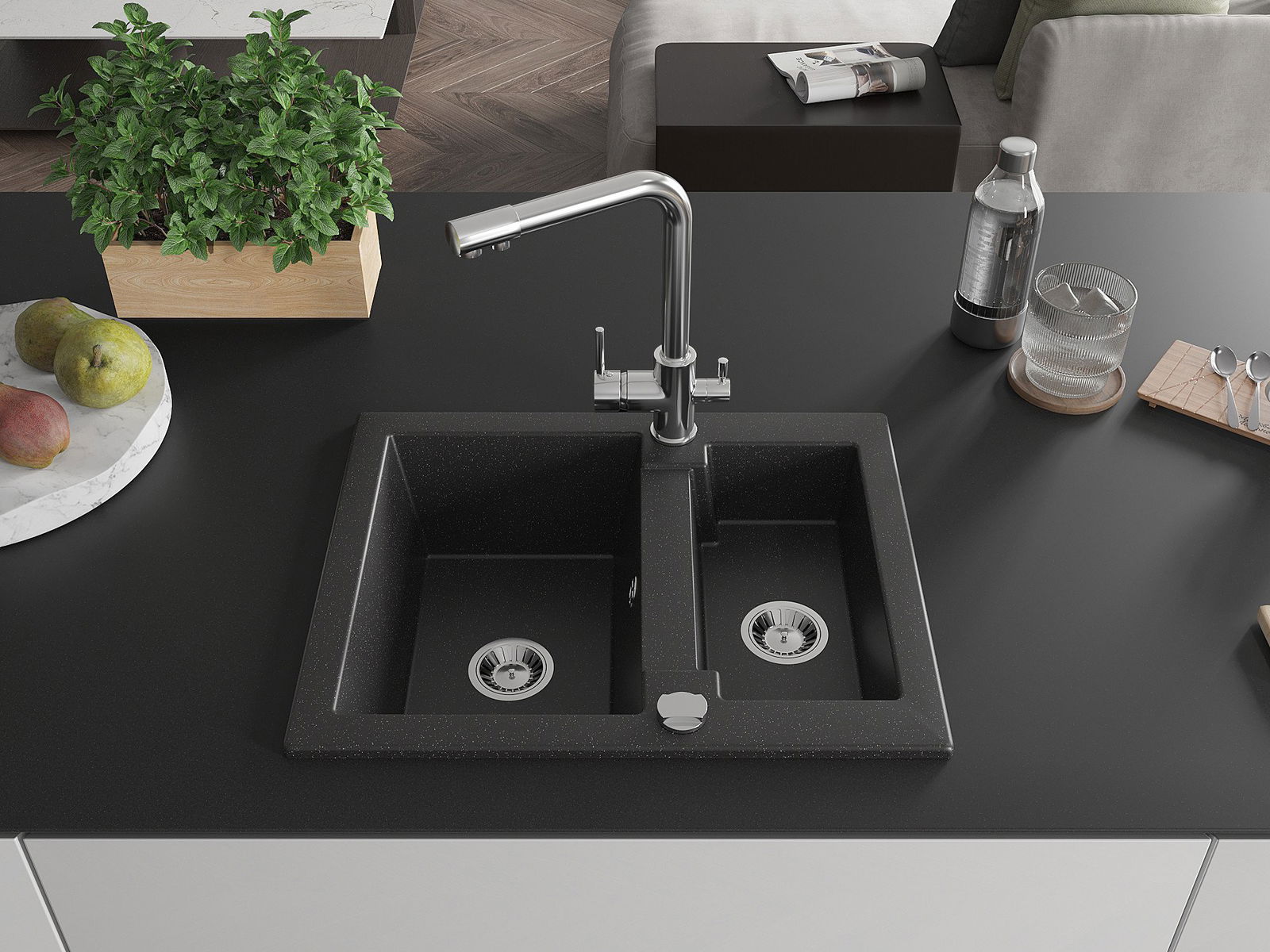A mosogató kiváló minőségű gránitból készül. Ez egy elegáns és mindenekelőtt minden konyhához praktikus kiegészítés, stílusától függetlenül. A kiváló minőségű és a gránit tartósság biztosítja a sok éves használatát.