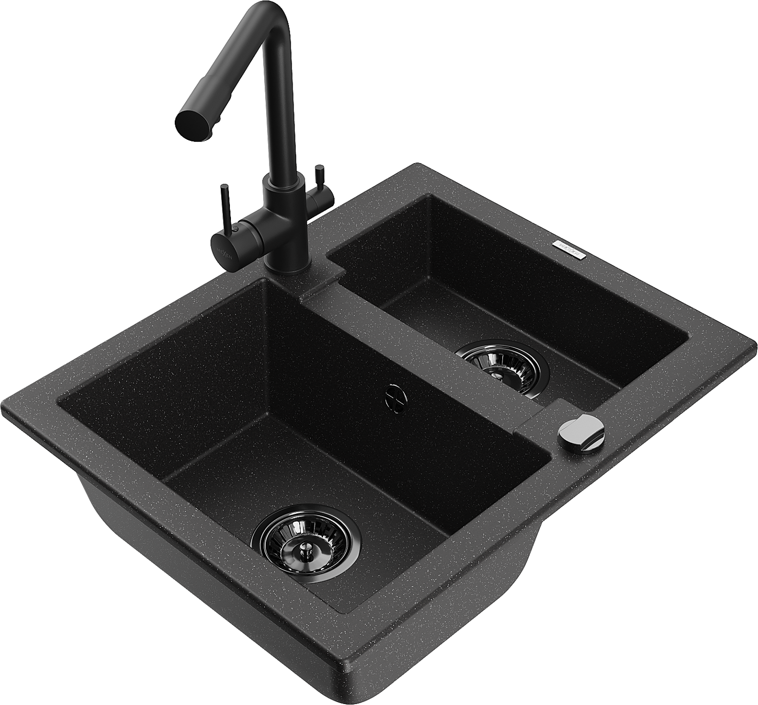 Mexen Carlos gránit mosogató 1,5 rekeszes Duero konyhai csapteleppel, fekete/ezüst metál - 6518-73-671600-70-B