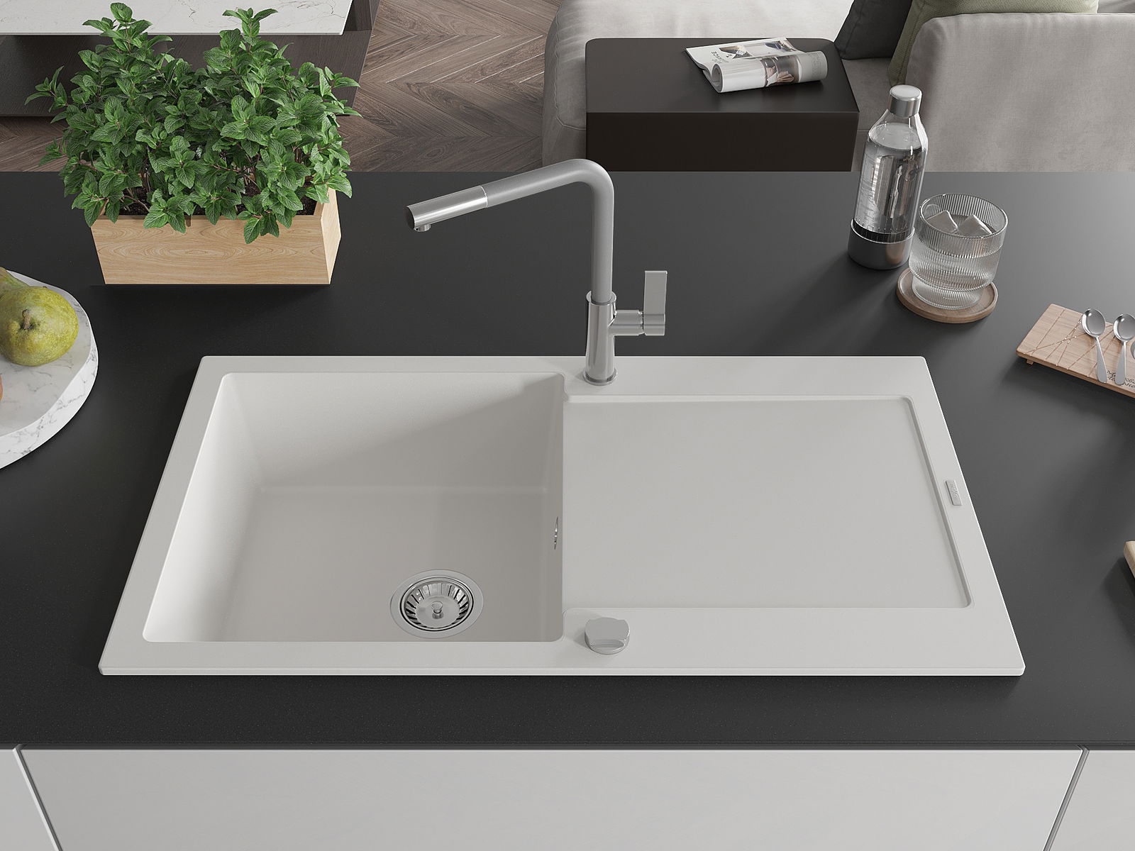 A mosogató kiváló minőségű gránitból készül. Ez egy elegáns és mindenekelőtt minden konyhához praktikus kiegészítés, stílusától függetlenül. A kiváló minőségű és a gránit tartósság biztosítja a sok éves használatát.