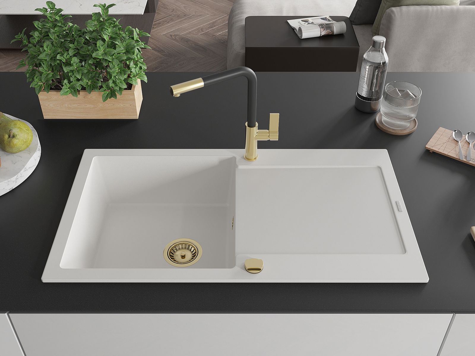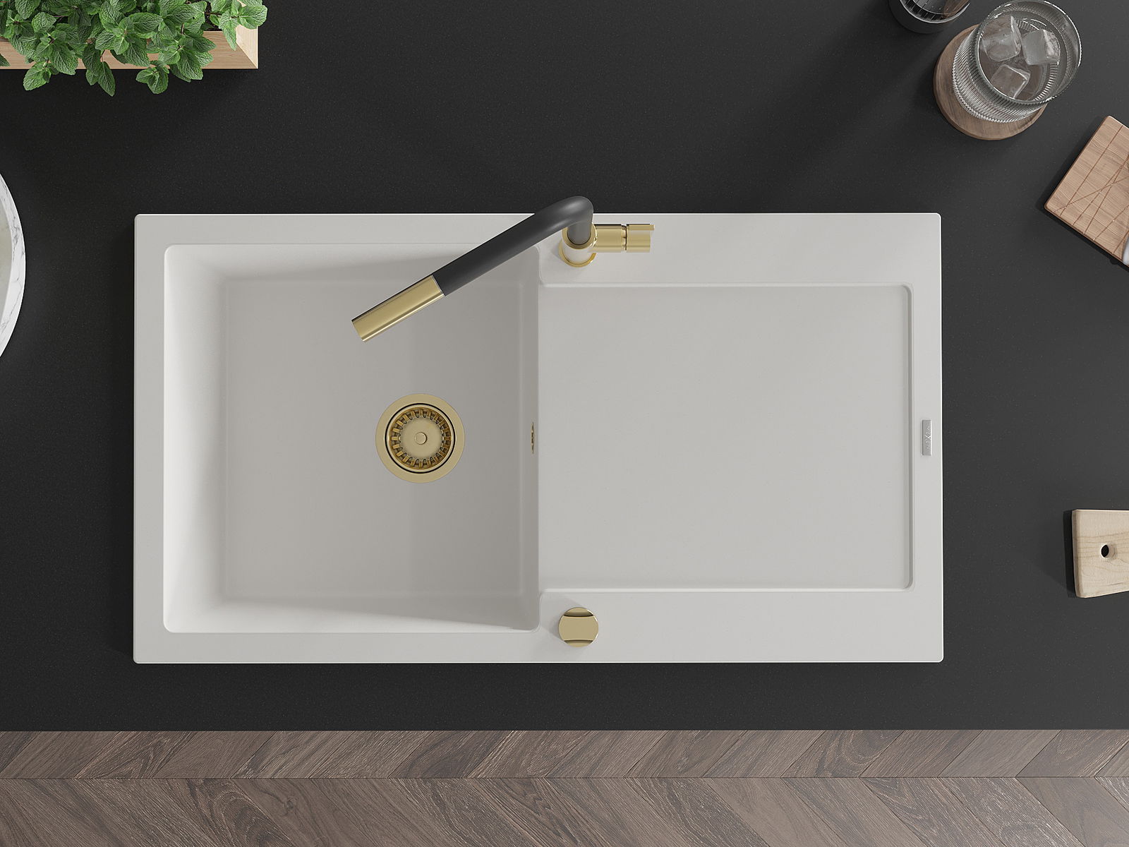 A mosogató kiváló minőségű gránitból készül. Ez egy elegáns és mindenekelőtt minden konyhához praktikus kiegészítés, stílusától függetlenül. A kiváló minőségű és a gránit tartósság biztosítja a sok éves használatát.
