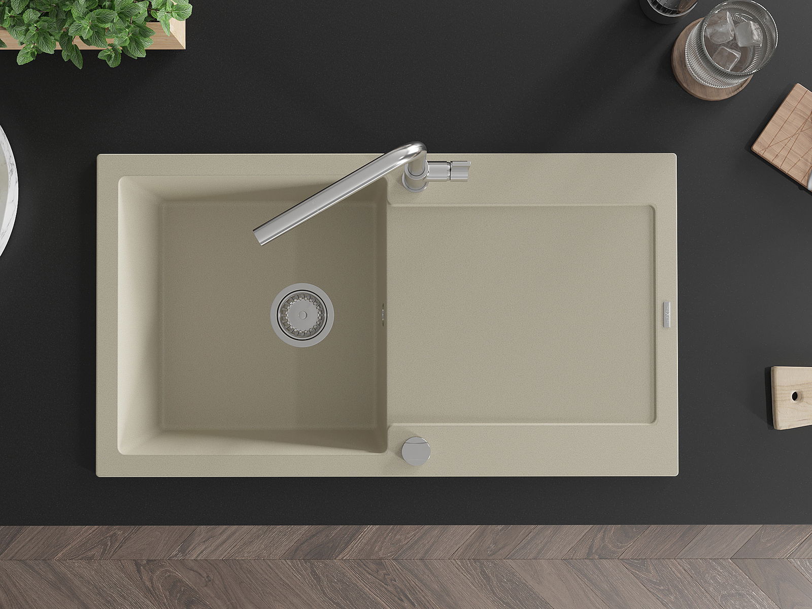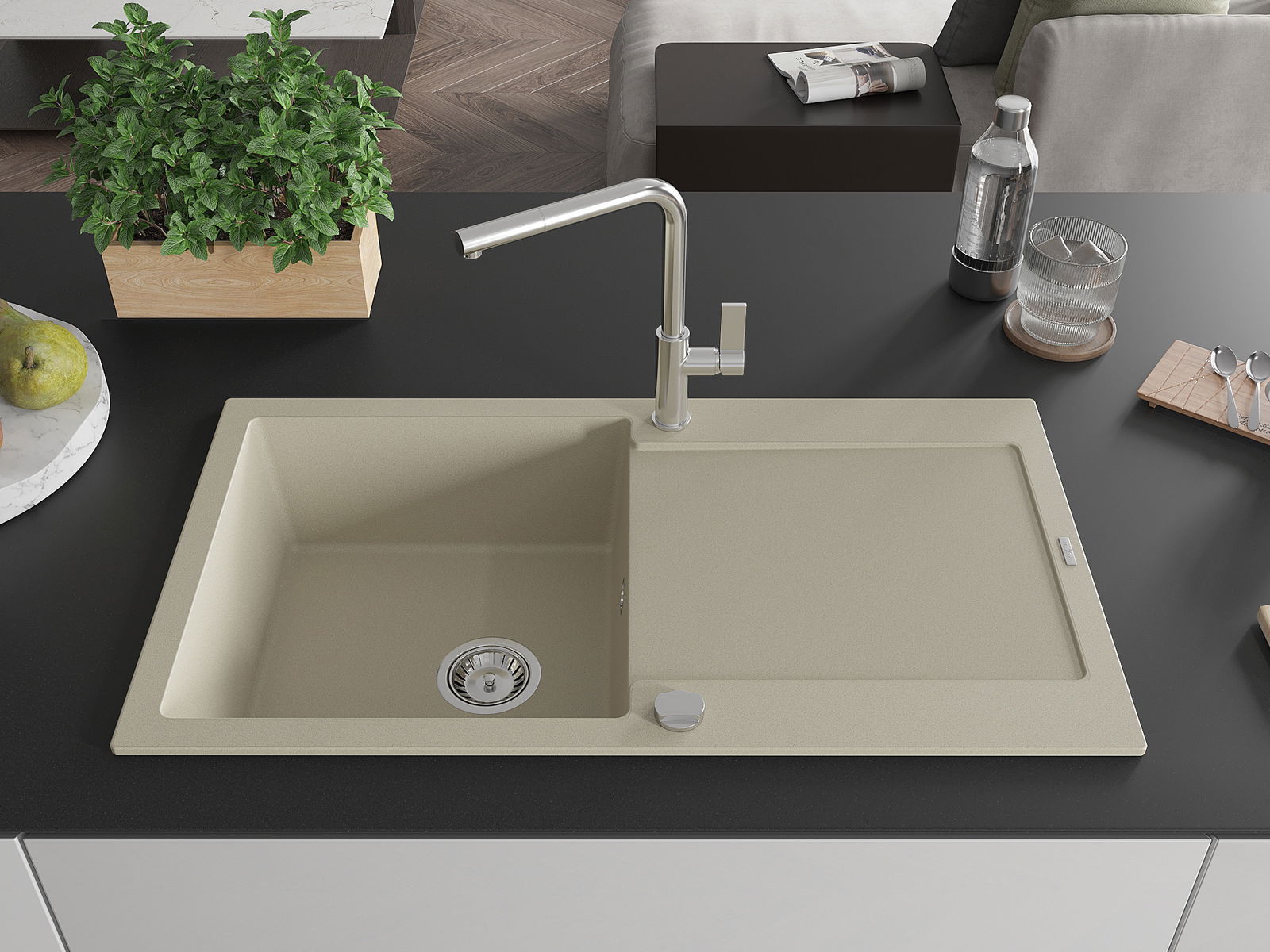 A mosogató kiváló minőségű gránitból készül. Ez egy elegáns és mindenekelőtt minden konyhához praktikus kiegészítés, stílusától függetlenül. A kiváló minőségű és a gránit tartósság biztosítja a sok éves használatát.