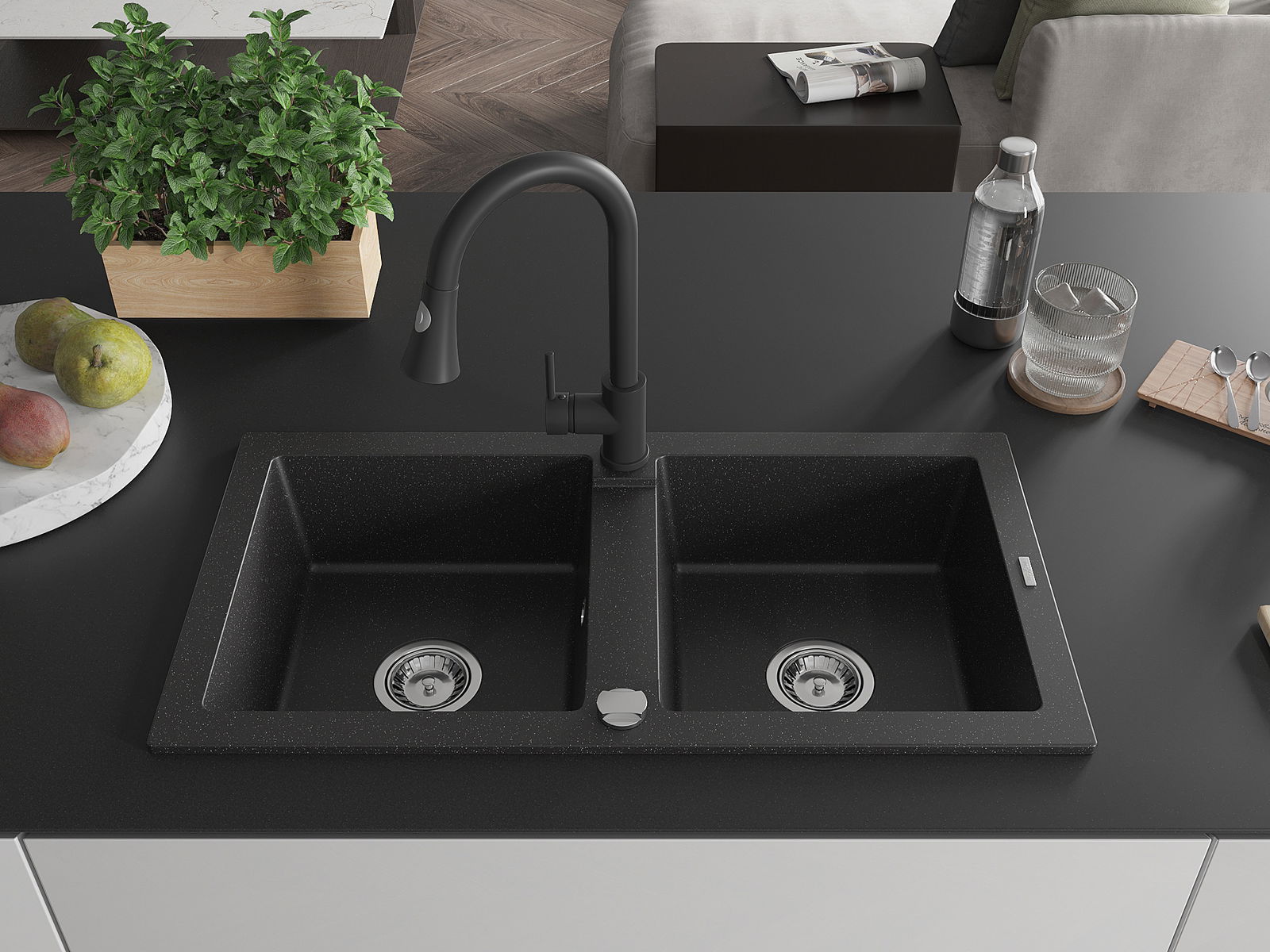 Mexen Mario gránit mosogató 2-medencés Elia konyhai csappal, fekete/ezüst metál - 6504-73-670101-70