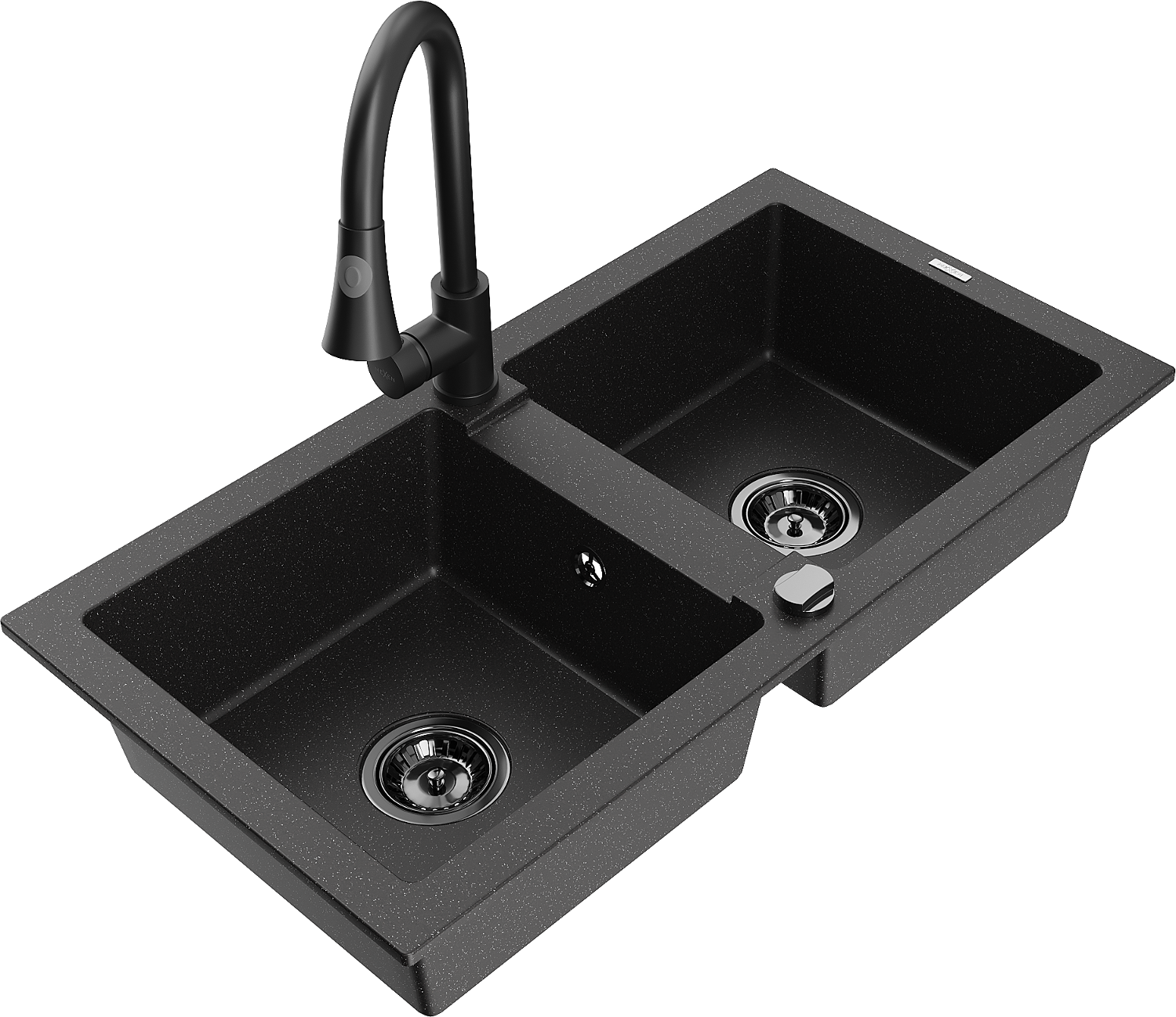 Mexen Mario 2 rekeszes gránit mosogató Elia konyhai csappal, fekete/ezüst metál - 6504-73-670101-70-B