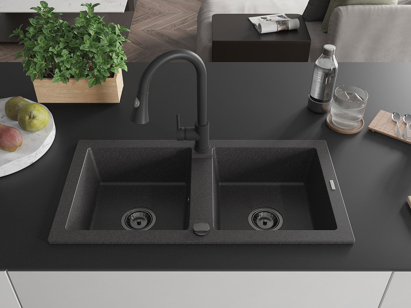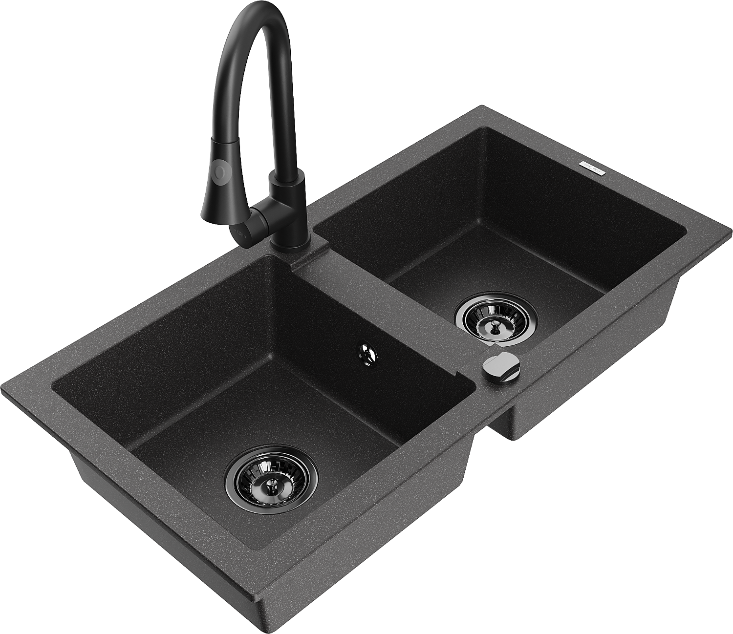 Mexen Mario gránit 2-medencés mosogató Elia konyhai csapteleppel, fekete pöttyös - 6504-76-670101-70-B