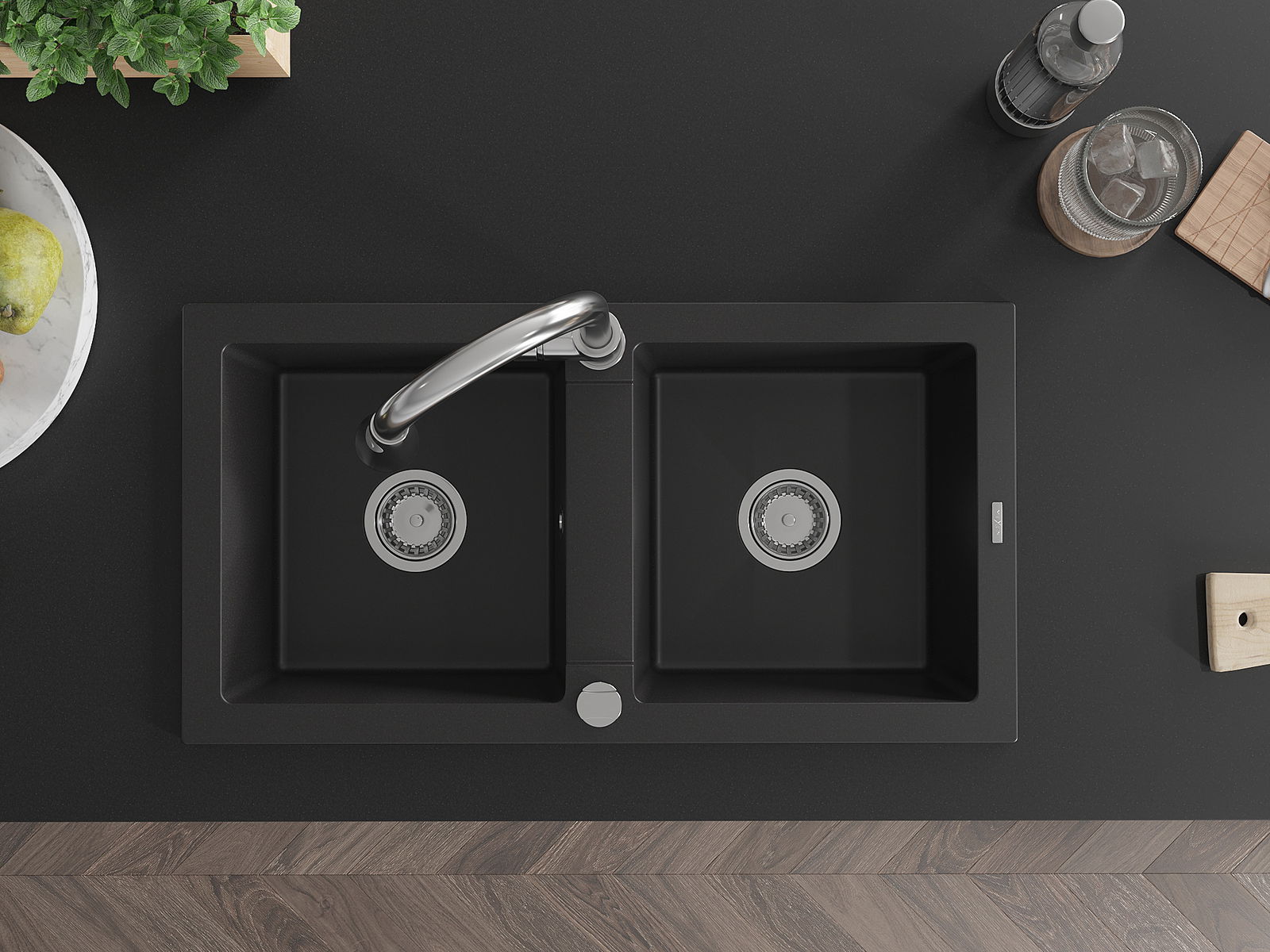 Mexen Mario gránit mosogató, 2 rekeszes, Elia konyhai csappal, fekete - 6504-77-670101-00