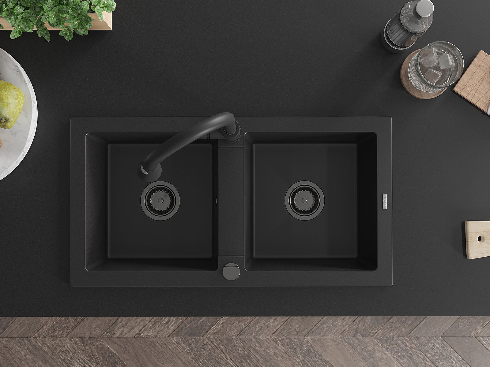 Mexen Mario 2 rekeszes gránit mosogatótálca Elia konyhai csapteleppel, fekete - 6504-77-670101-70-B