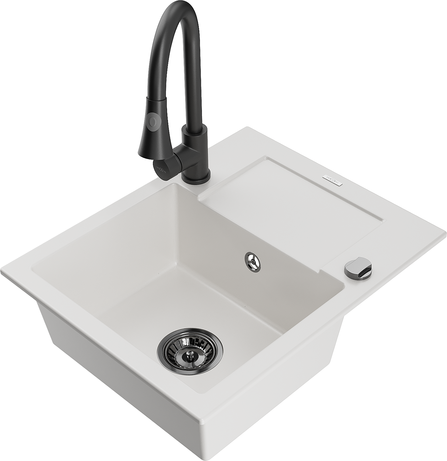 Mexen Enzo 1-medencés gránit mosogató csepptálcával és Elia konyhai csappal, fehér - 6506-20-670101-70
