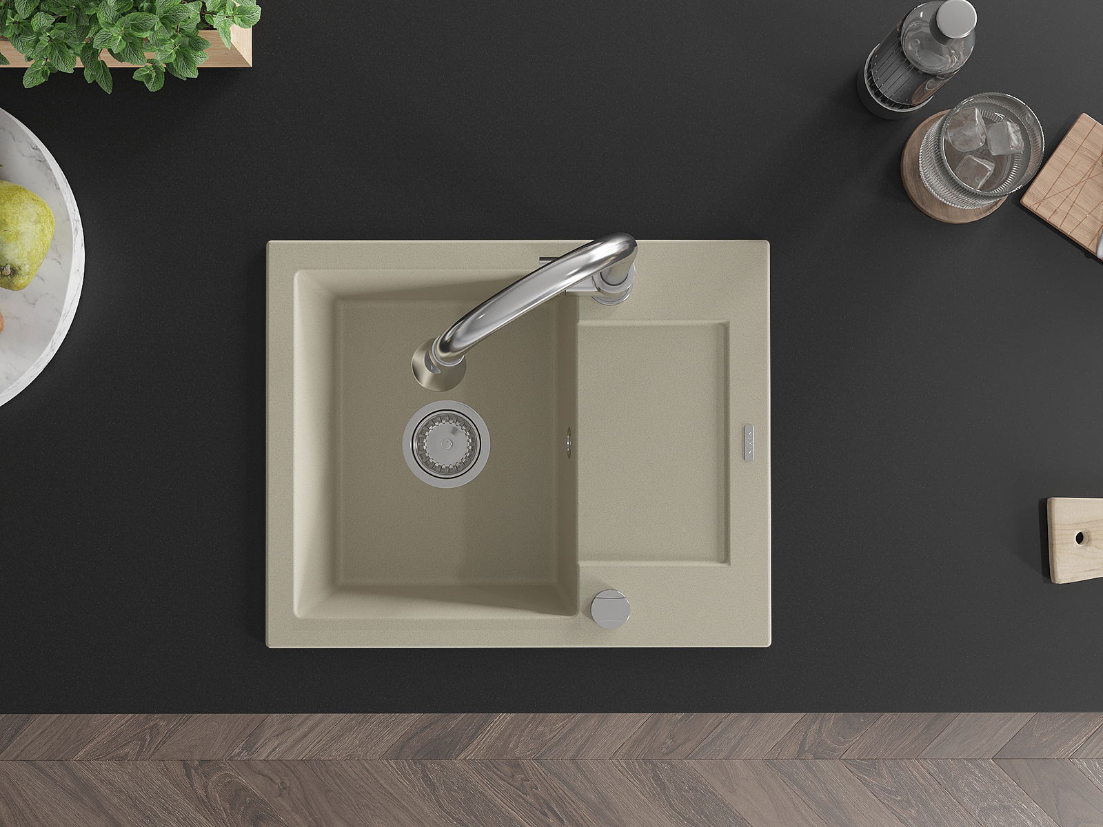 Mexen Enzo gránit mosogató 1 rekeszes csepegtetővel és Elia konyhai csapteleppel, bézs - 6506-69-670101-00