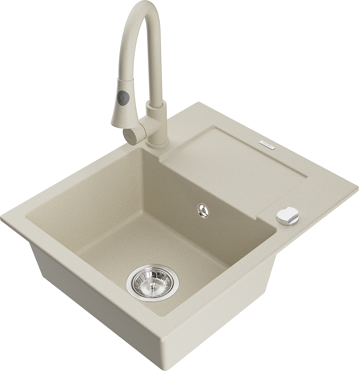 Mexen Enzo egymedencés gránit mosogató csepegtetővel és Elia konyhai csapteleppel, bézs - 6506-69-670101-69