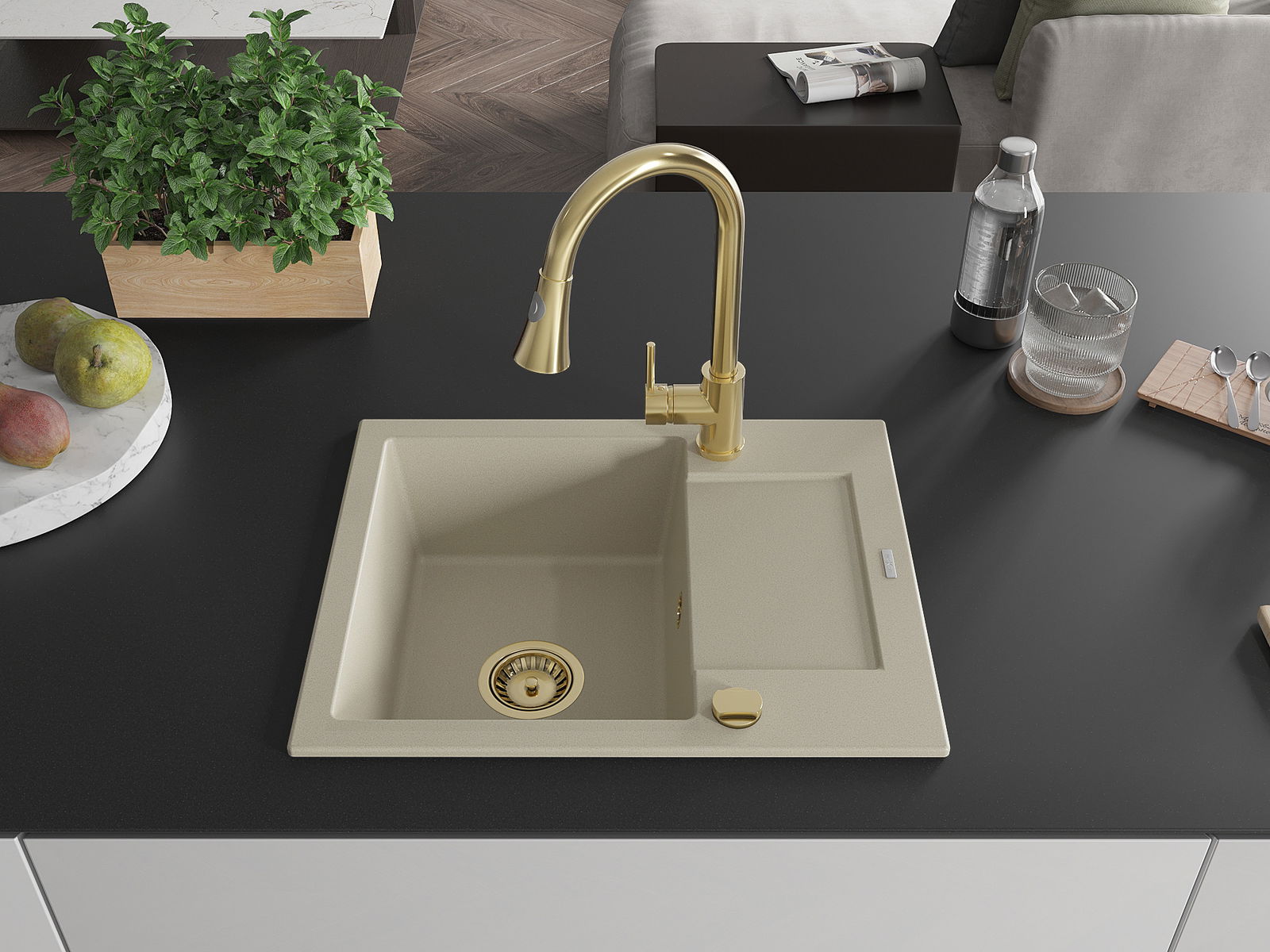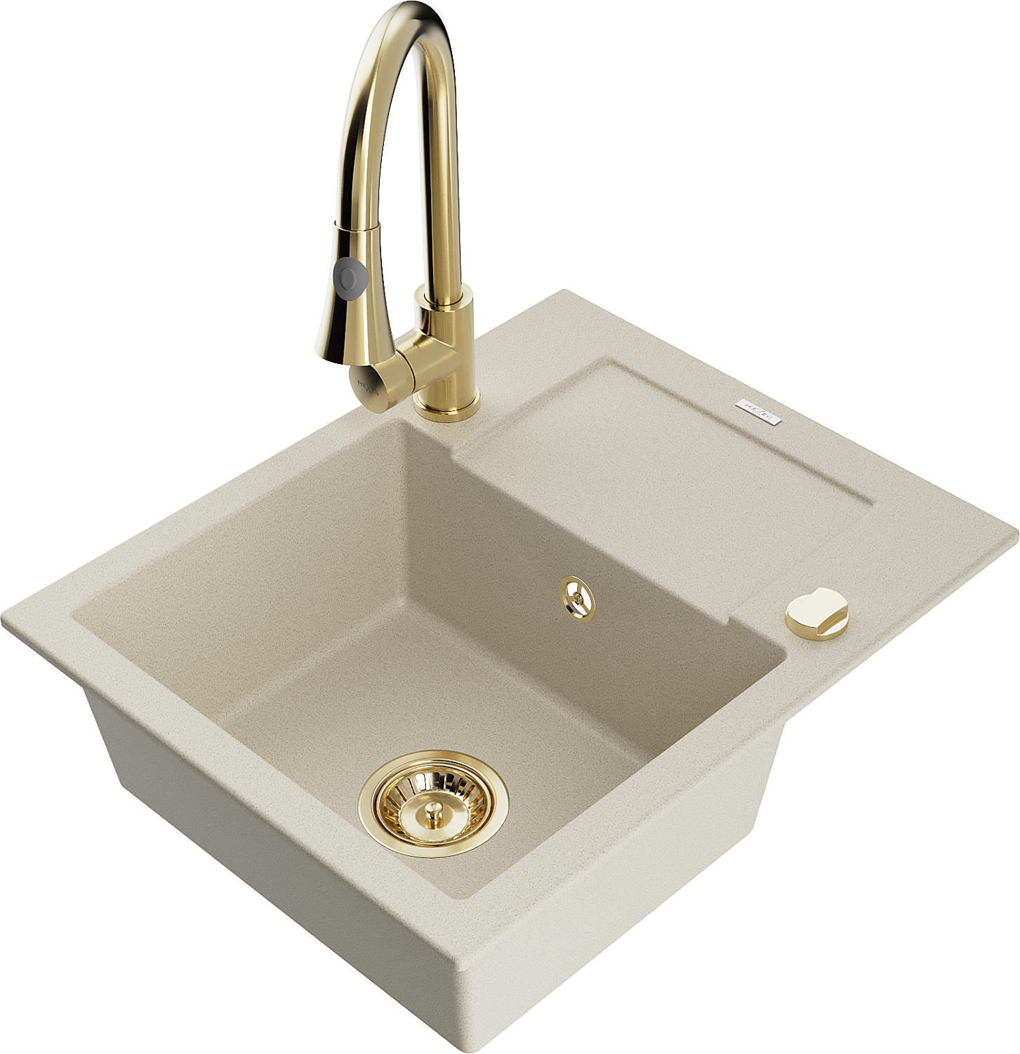 Mexen Enzo gránit mosogató 1-medencés csepegtetővel és Elia konyhai csapteleppel, bézs - 6506-69-670101-50