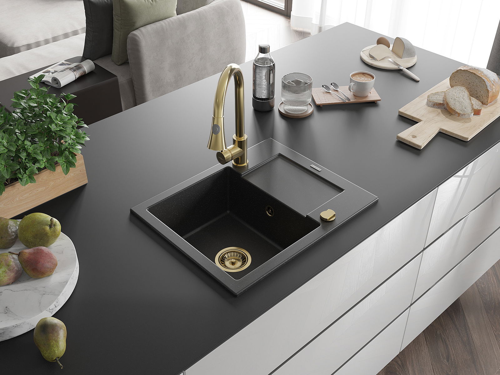 A mosogató kiváló minőségű gránitból készül. Ez egy elegáns és mindenekelőtt minden konyhához praktikus kiegészítés, stílusától függetlenül. A kiváló minőségű és a gránit tartósság biztosítja a sok éves használatát.