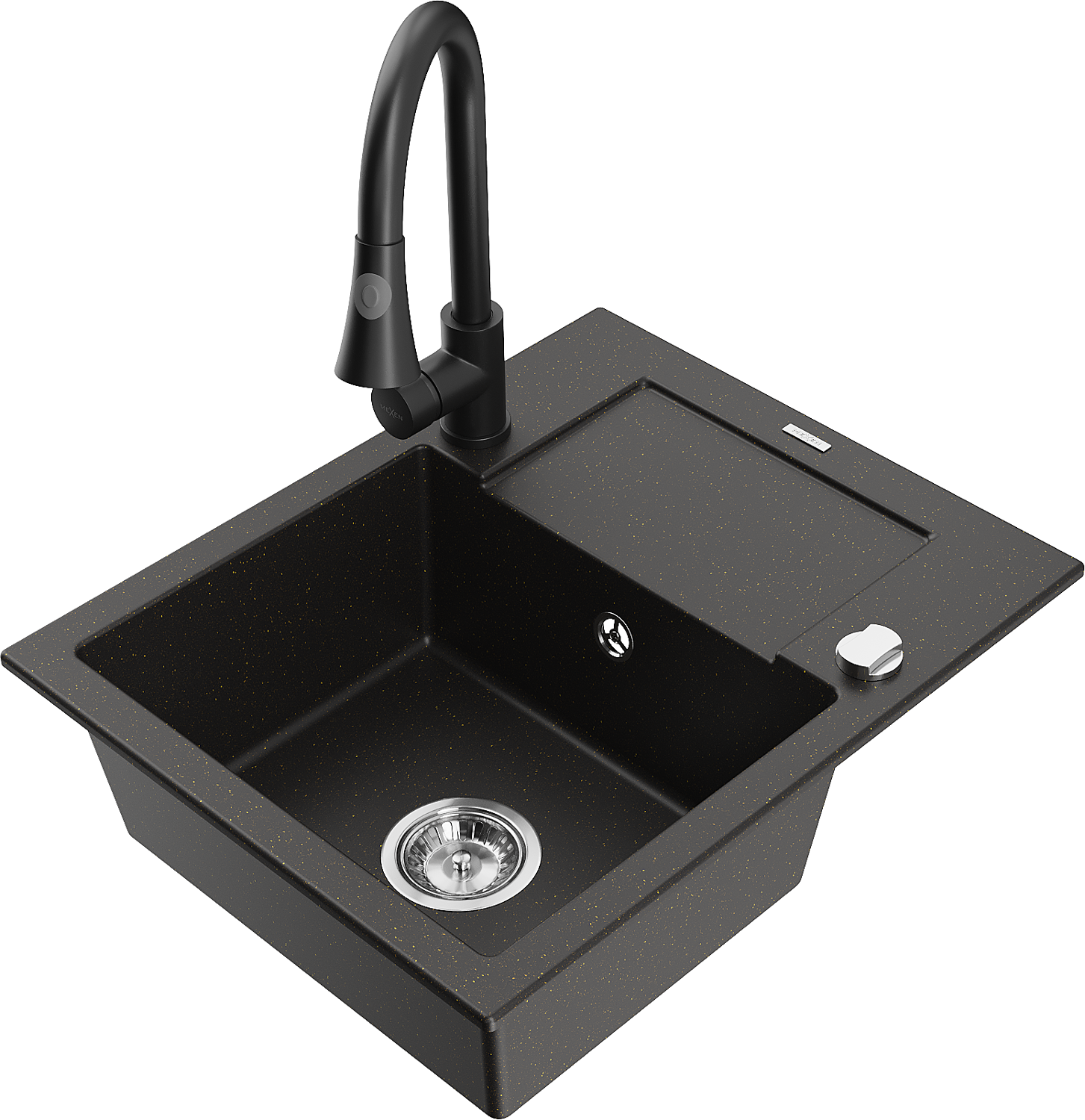 Mexen Enzo egymedencés gránit mosogató csepegtetővel és Elia konyhai csappal, fekete/arany metál - 6506-75-670101-70