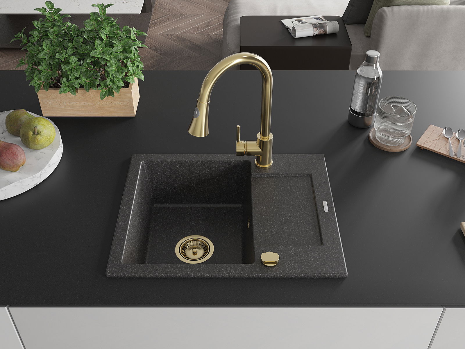A mosogató kiváló minőségű gránitból készül. Ez egy elegáns és mindenekelőtt minden konyhához praktikus kiegészítés, stílusától függetlenül. A kiváló minőségű és a gránit tartósság biztosítja a sok éves használatát.