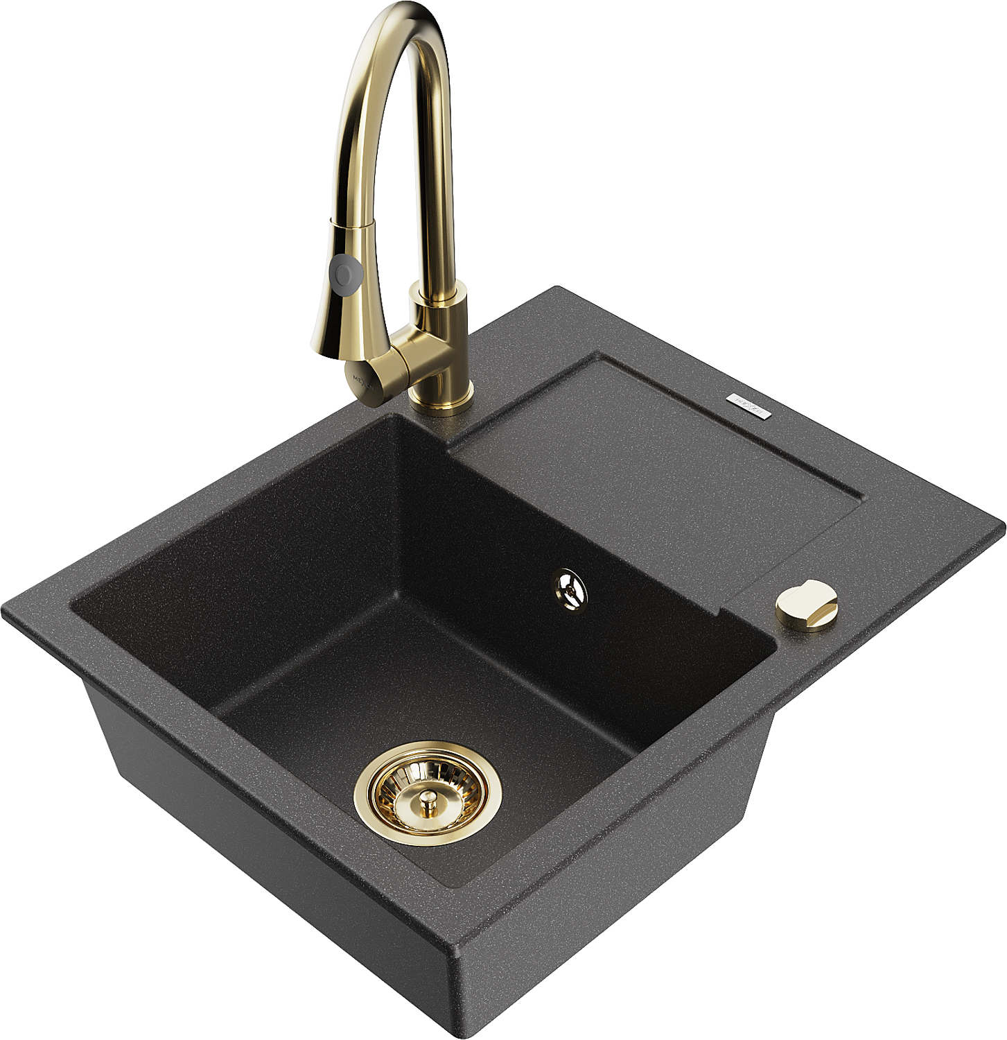 Mexen Enzo gránit mosogató, 1 rekeszes csepegtetővel és Elia konyhai csappal, fekete pöttyös - 6506-76-670101-50
