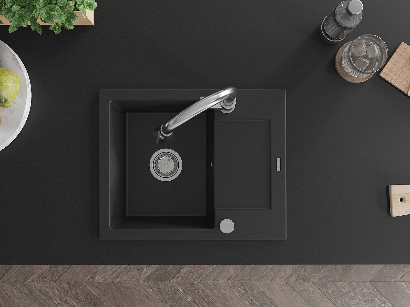 Mexen Enzo 1-medencés gránit mosogató lefolyóval és Elia konyhai csapteleppel, fekete - 6506-77-670101-00