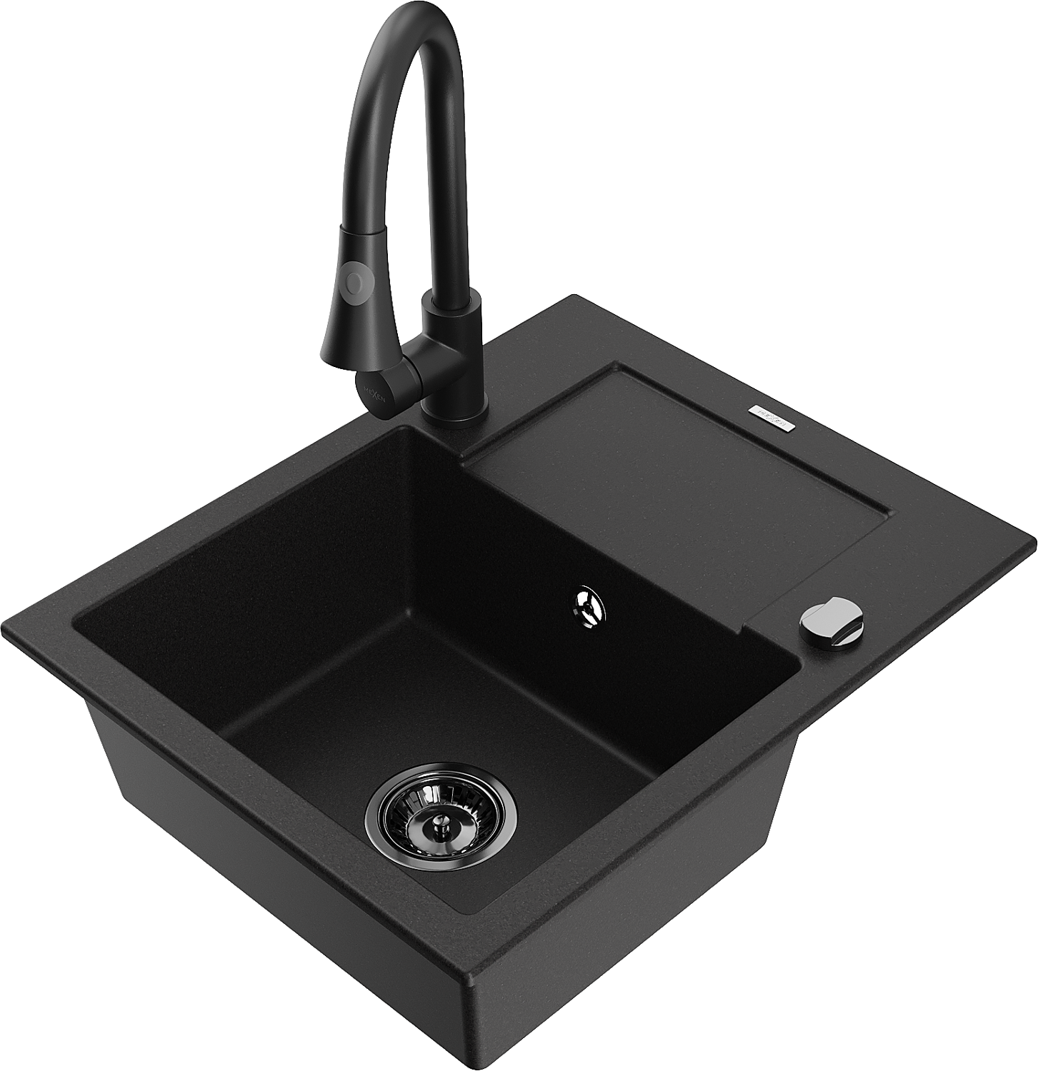 Mexen Enzo egykamrás gránit mosogató csepegtetővel és Elia konyhai csappal, fekete - 6506-77-670101-70-B