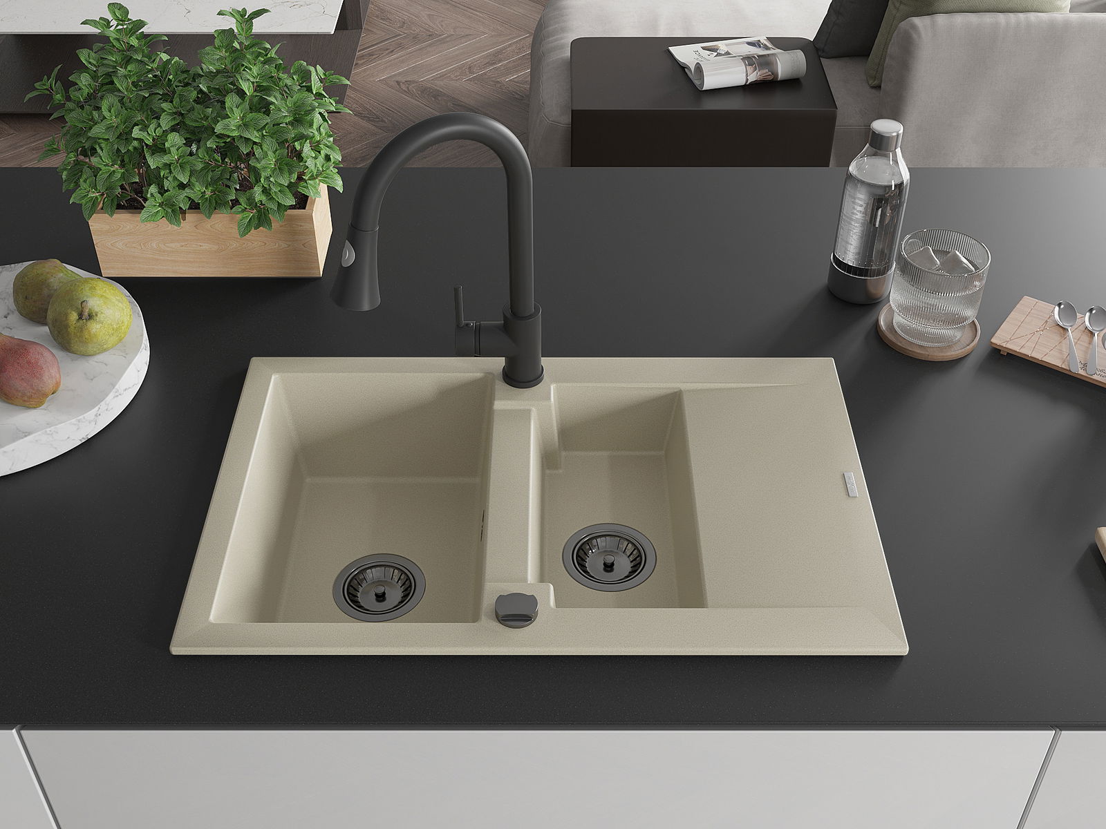 A mosogató kiváló minőségű gránitból készül. Ez egy elegáns és mindenekelőtt minden konyhához praktikus kiegészítés, stílusától függetlenül. A kiváló minőségű és a gránit tartósság biztosítja a sok éves használatát.