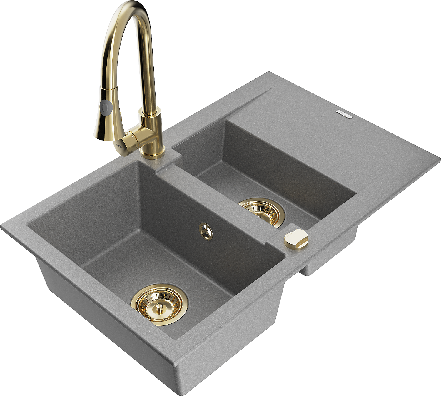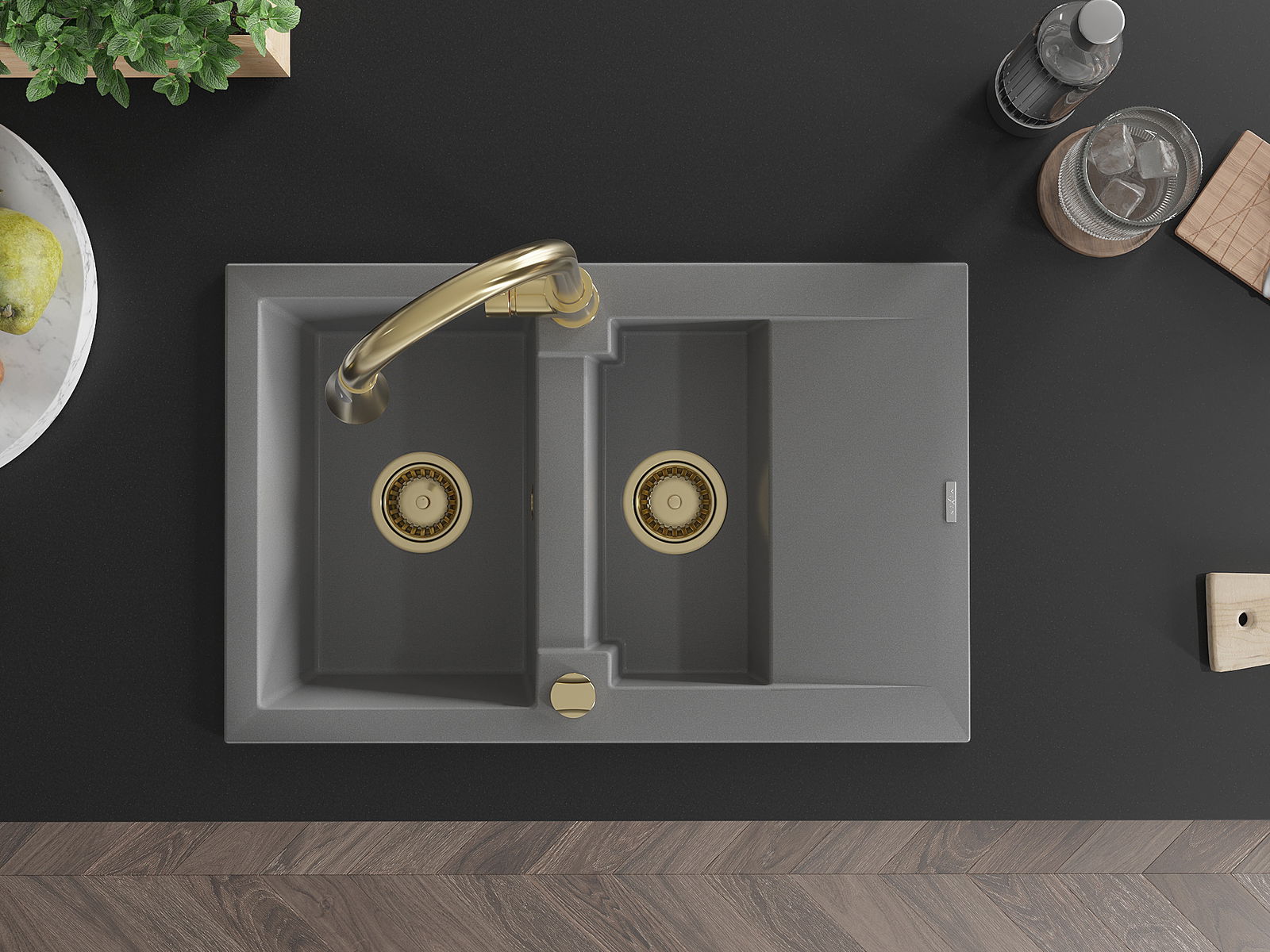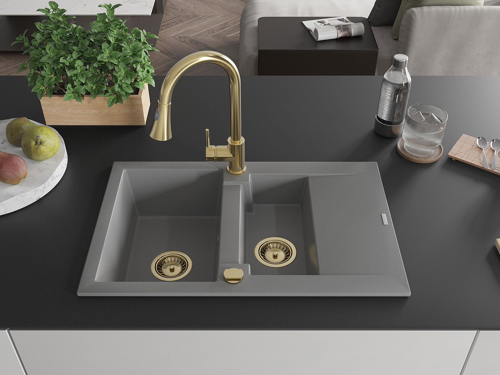 Mexen Gaspar gránit mosogató 1,5 rekeszes csöpögtetővel és Elia konyhai csapteleppel, szürke - 6507-71-670101-50