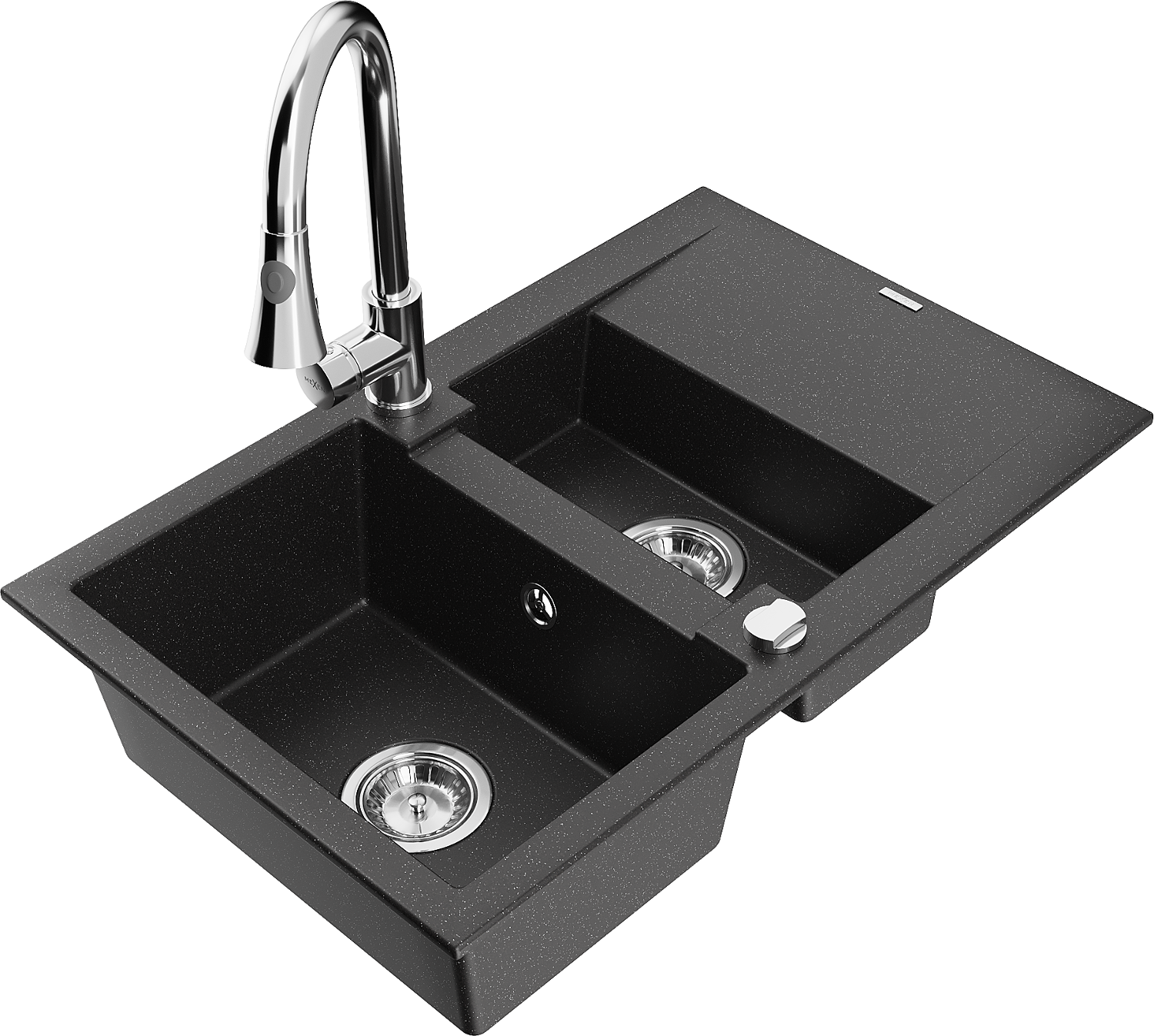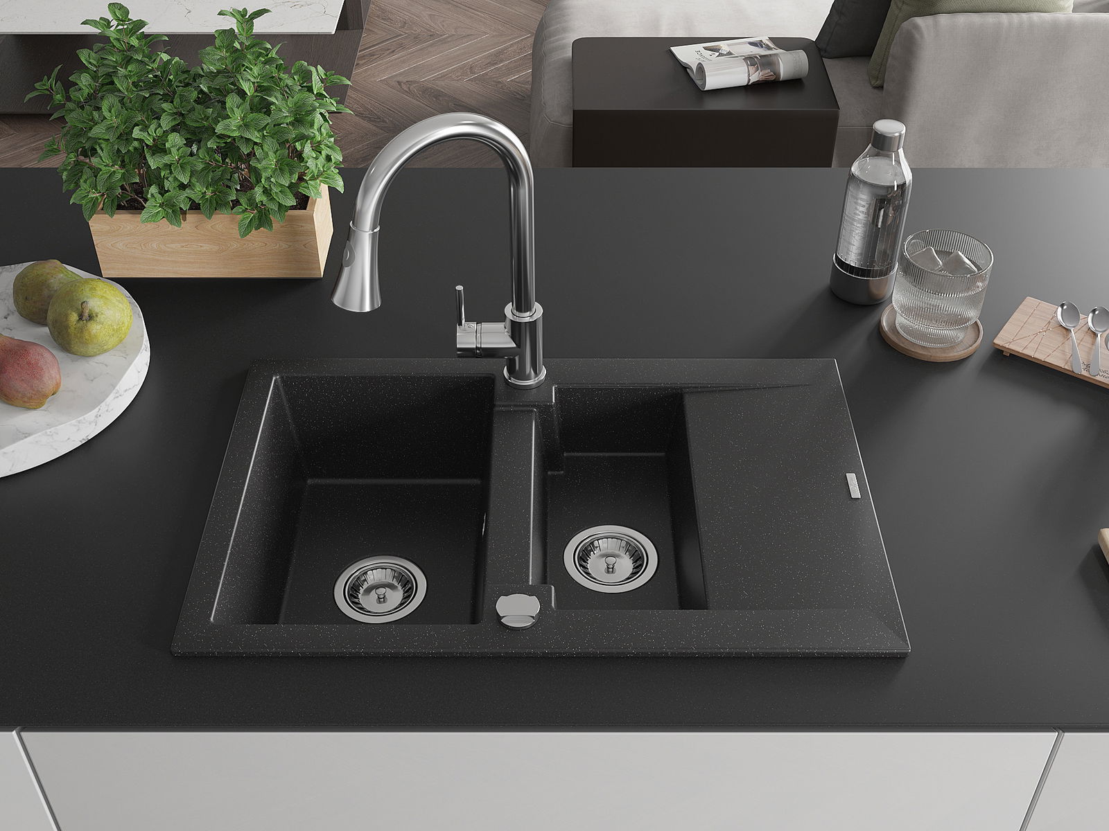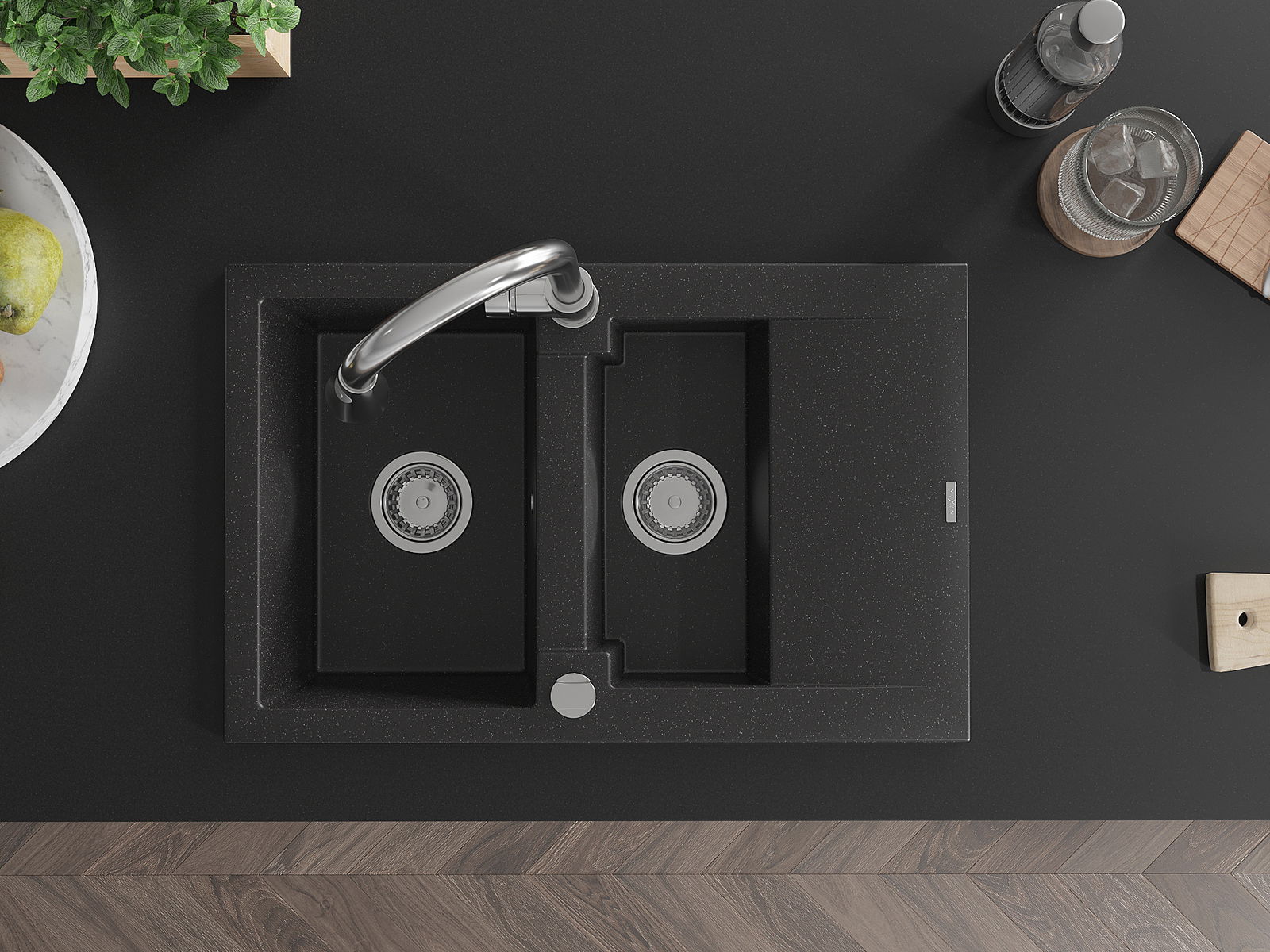 Mexen Gaspar gránit mosogató 1,5 rekeszes csepegtetővel és Elia konyhai csapteleppel, fekete/ezüst metál - 6507-73-670101-00