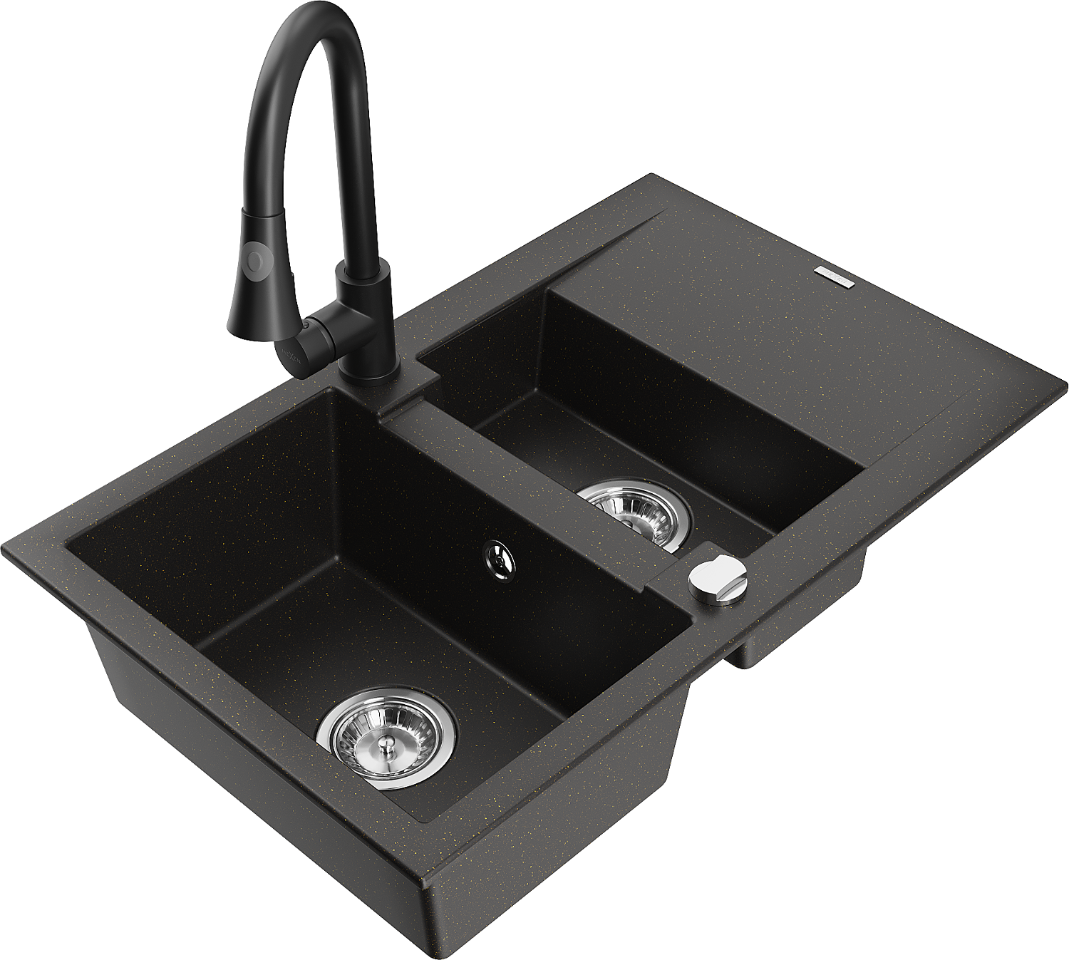Mexen Gaspar 1,5 rekeszes, elvezetős gránit mosogató Elia konyhai csappal, fekete/arany metál - 6507-75-670101-70