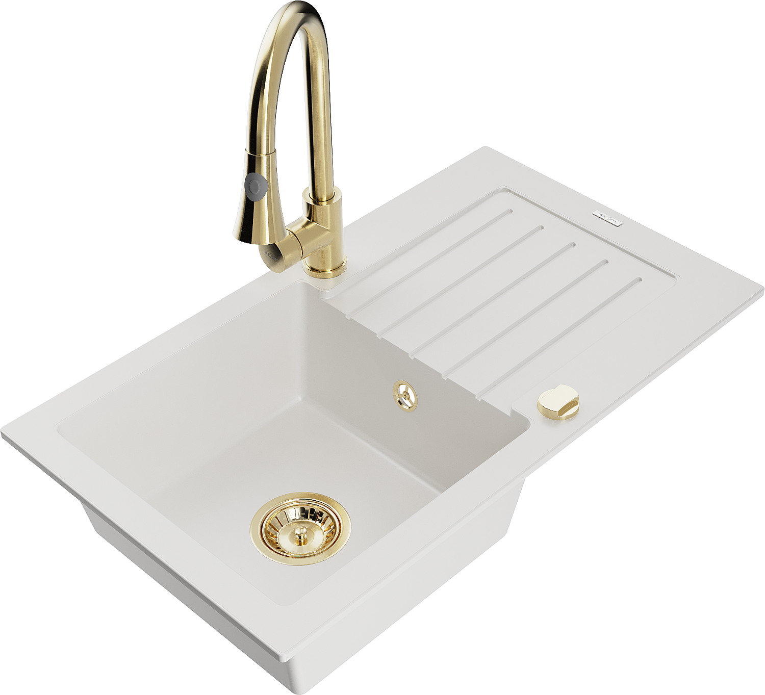 Mexen Pablo egymedencés gránit mosogató csepegtetővel és Elia konyhai csapteleppel, fehér - 6510-20-670101-50