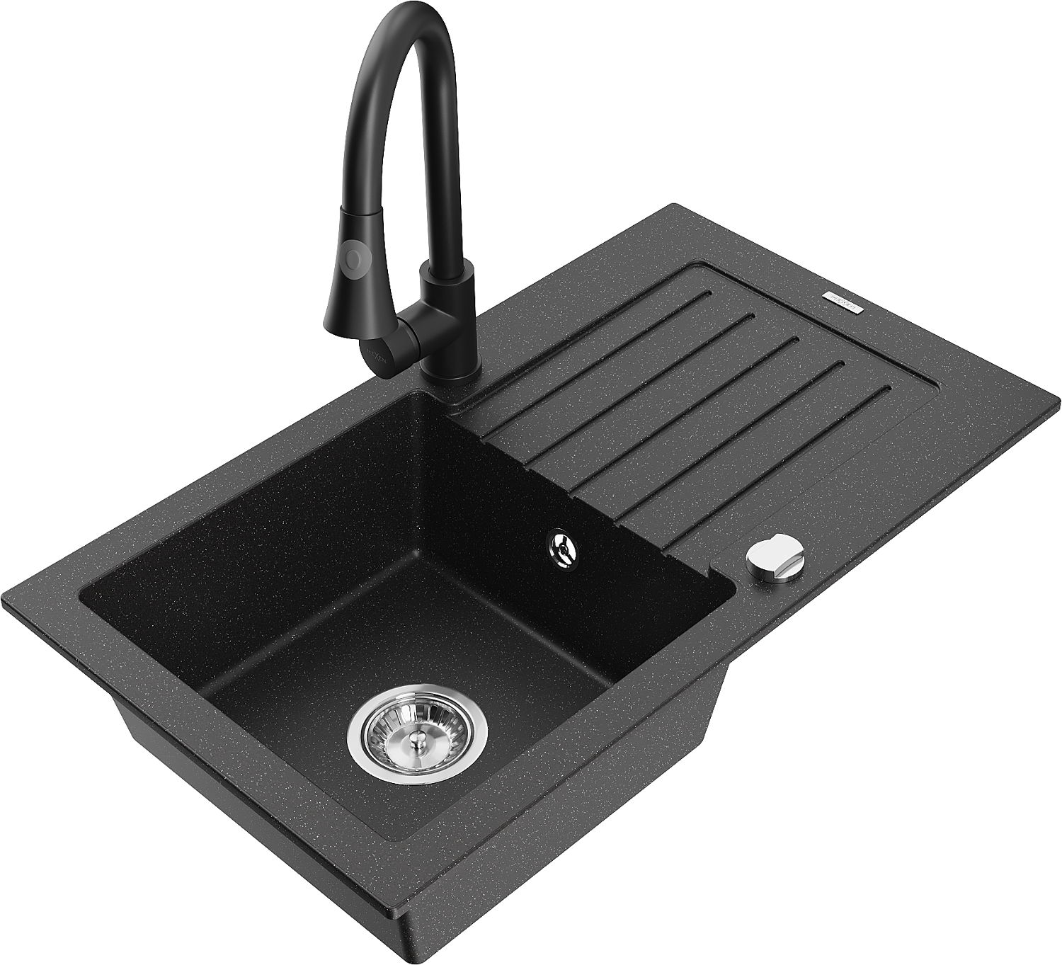 Mexen Pablo 1-medencés gránit mosogató csepegtetővel és Elia konyhai csappal, fekete/ezüst metál - 6510-73-670101-70