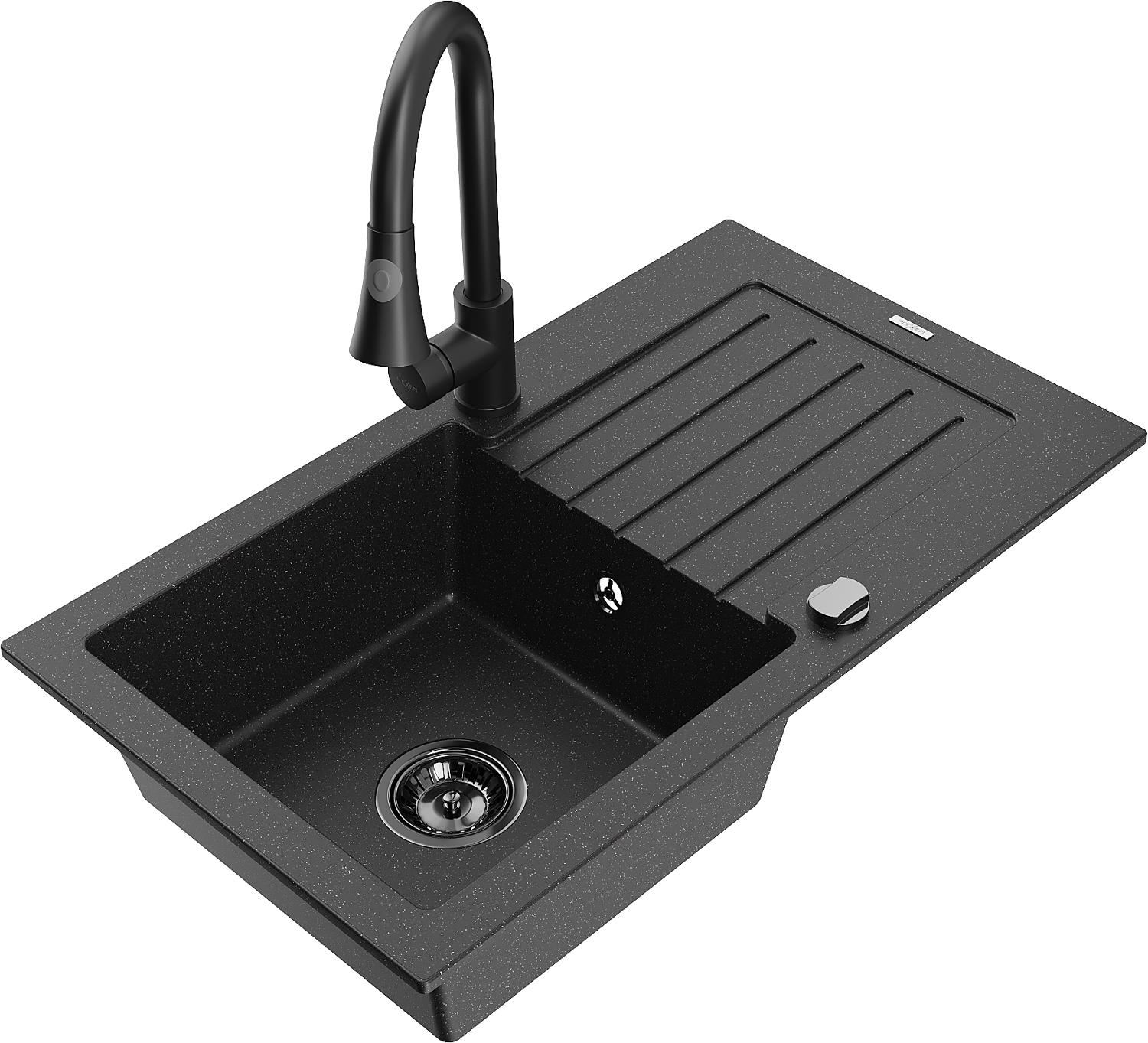 Mexen Pablo egymedencés gránit mosogató csepegtetővel és Elia konyhai csapteleppel, fekete/ezüst metál - 6510-73-670101-70-B