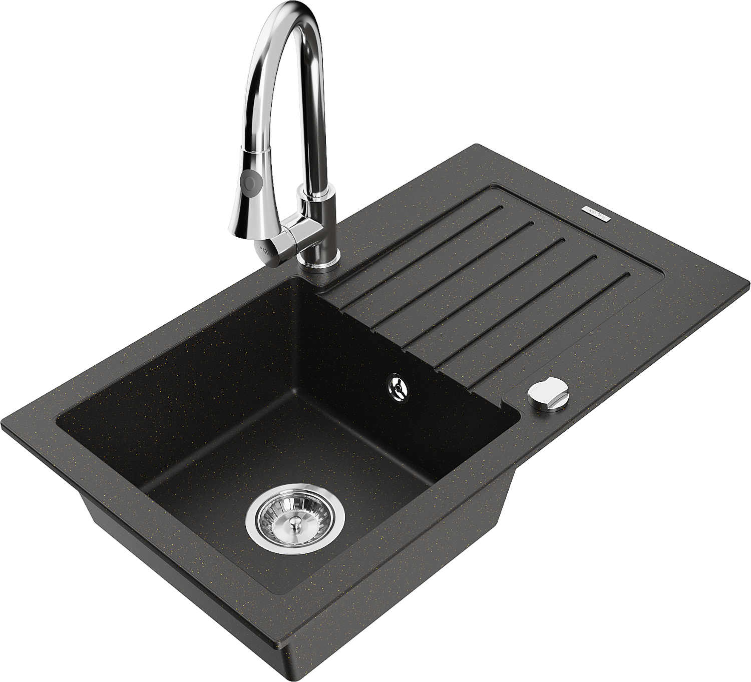 Mexen Pablo 1 medencés gránit mosogató csepegtetővel és Elia konyhai csapteleppel, fekete/arany metál - 6510-75-670101-00