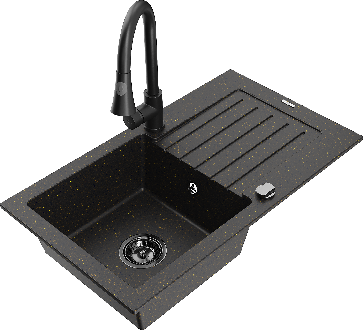 Mexen Pablo 1 rekeszes gránit mosogató lefolyóval és Elia konyhai csapteleppel, fekete/arany metál - 6510-75-670101-70-B