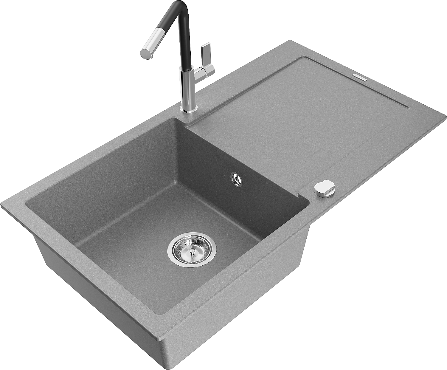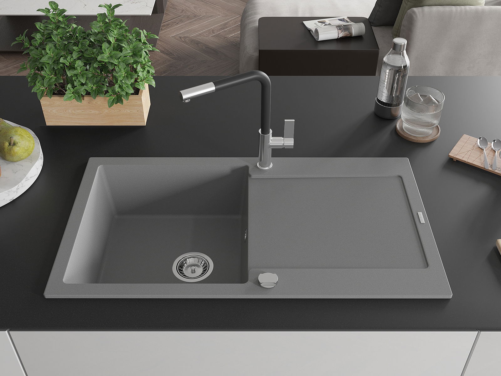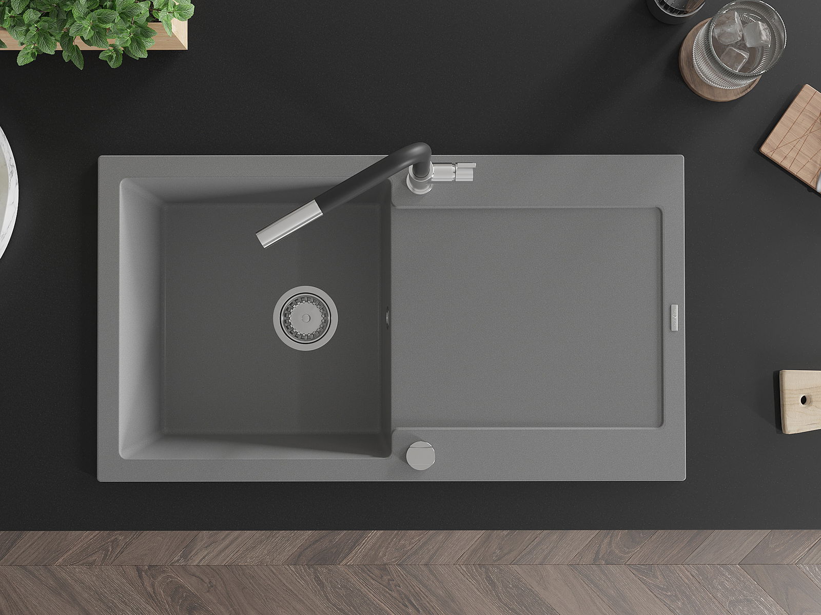 Mexen Leo egymedencés gránit mosogató csepegtetővel és Flora konyhai csapteleppel, szürke - 6501-71-670401-07