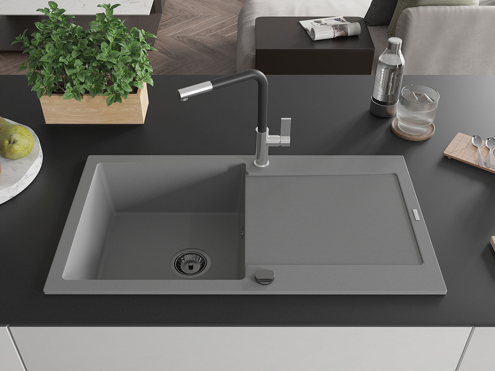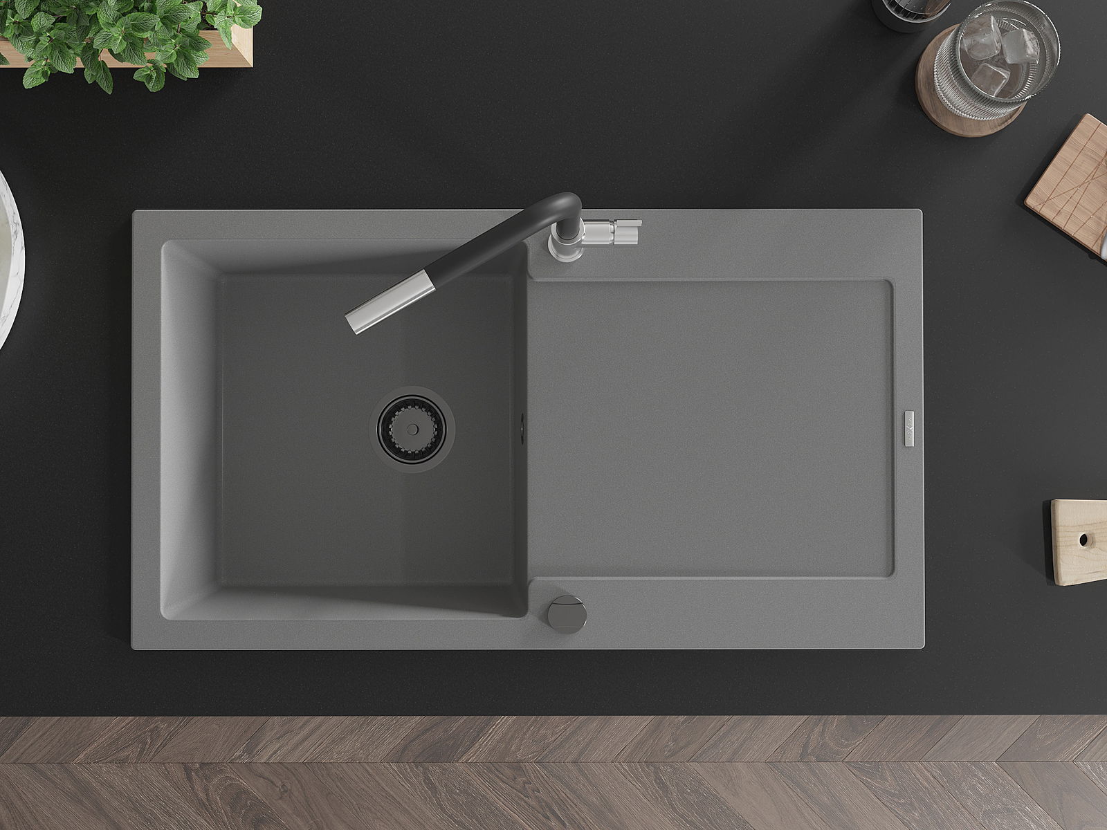 Mexen Leo egymedencés gránit mosogató csepegtetővel és Flora konyhai csapteleppel, szürke - 6501-71-670401-07-B