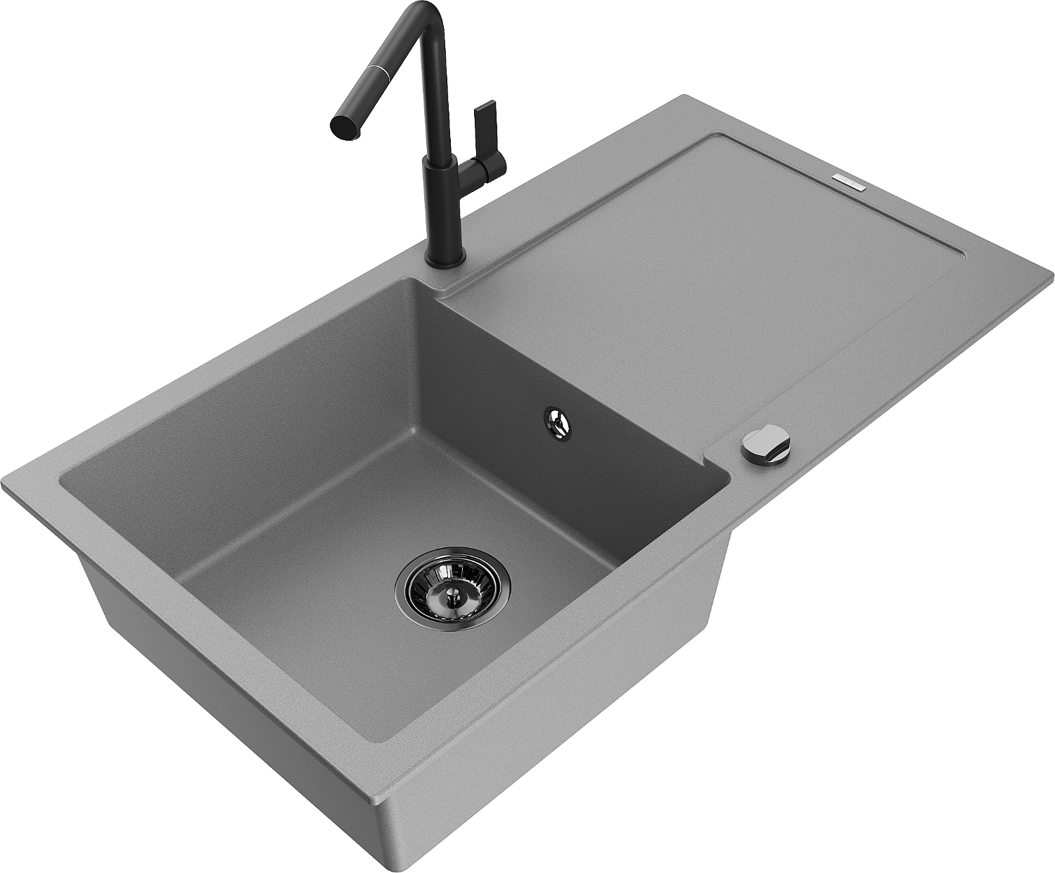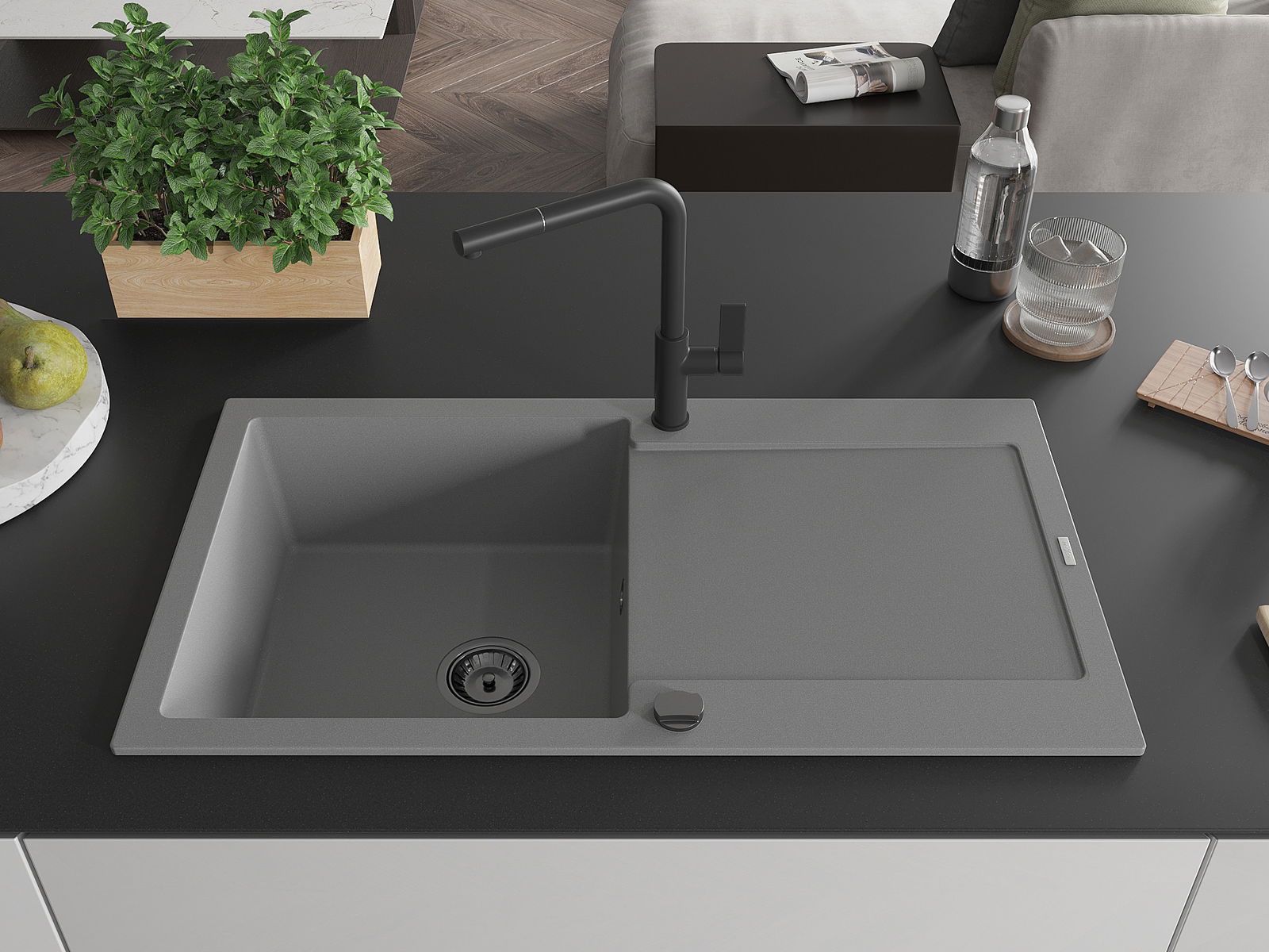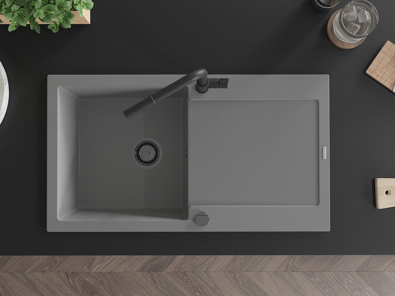 Mexen Leo egymedencés gránit mosogató csepegtetővel és Flora konyhai csapteleppel, szürke - 6501-71-670401-70-B