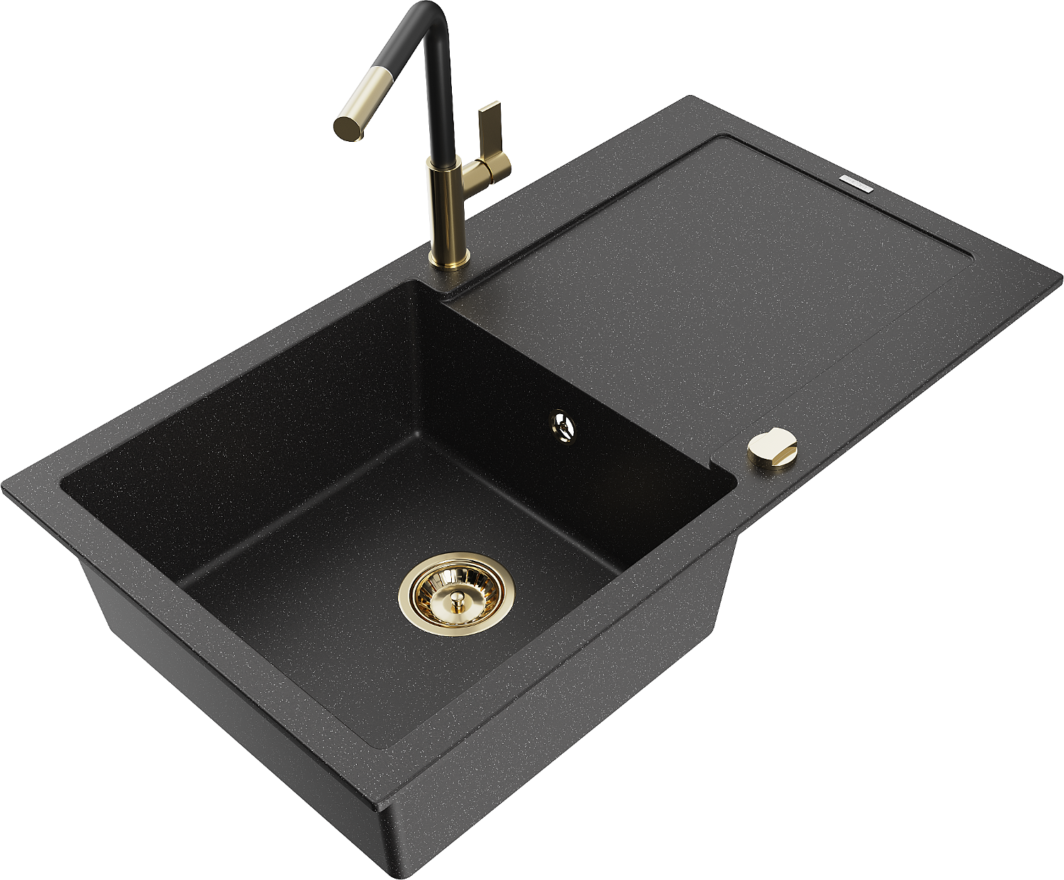 Mexen Leo egykamrás gránit mosogató lefolyóval és Flora konyhai csapteleppel, fekete/ezüst metál - 6501-73-670401-57-G