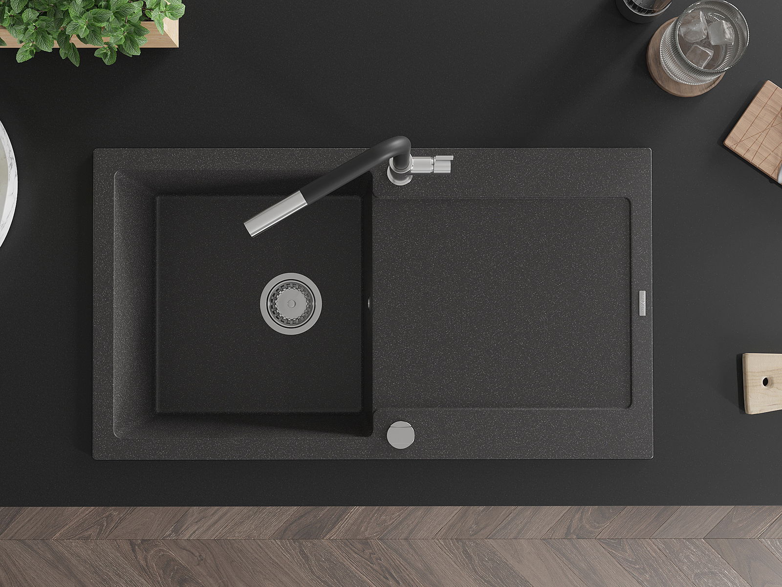 Mexen Leo egytálcás gránit mosogató csepegtetővel és Flora konyhai csapteleppel, fekete pettyes - 6501-76-670401-07