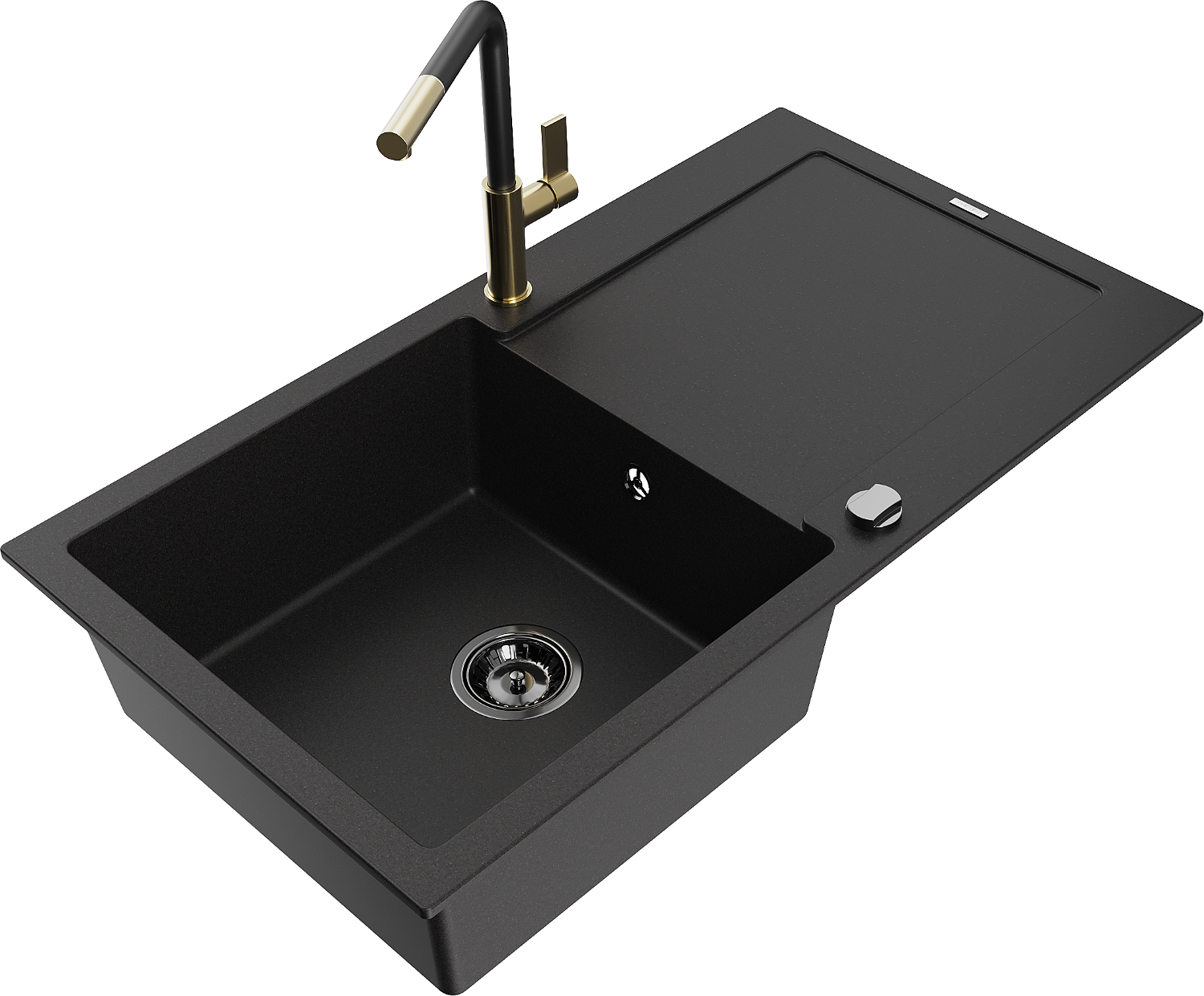 Mexen Leo egykamrás gránit mosogató csepegtetővel és Flora konyhai csapteleppel, fekete - 6501-77-670401-57-B