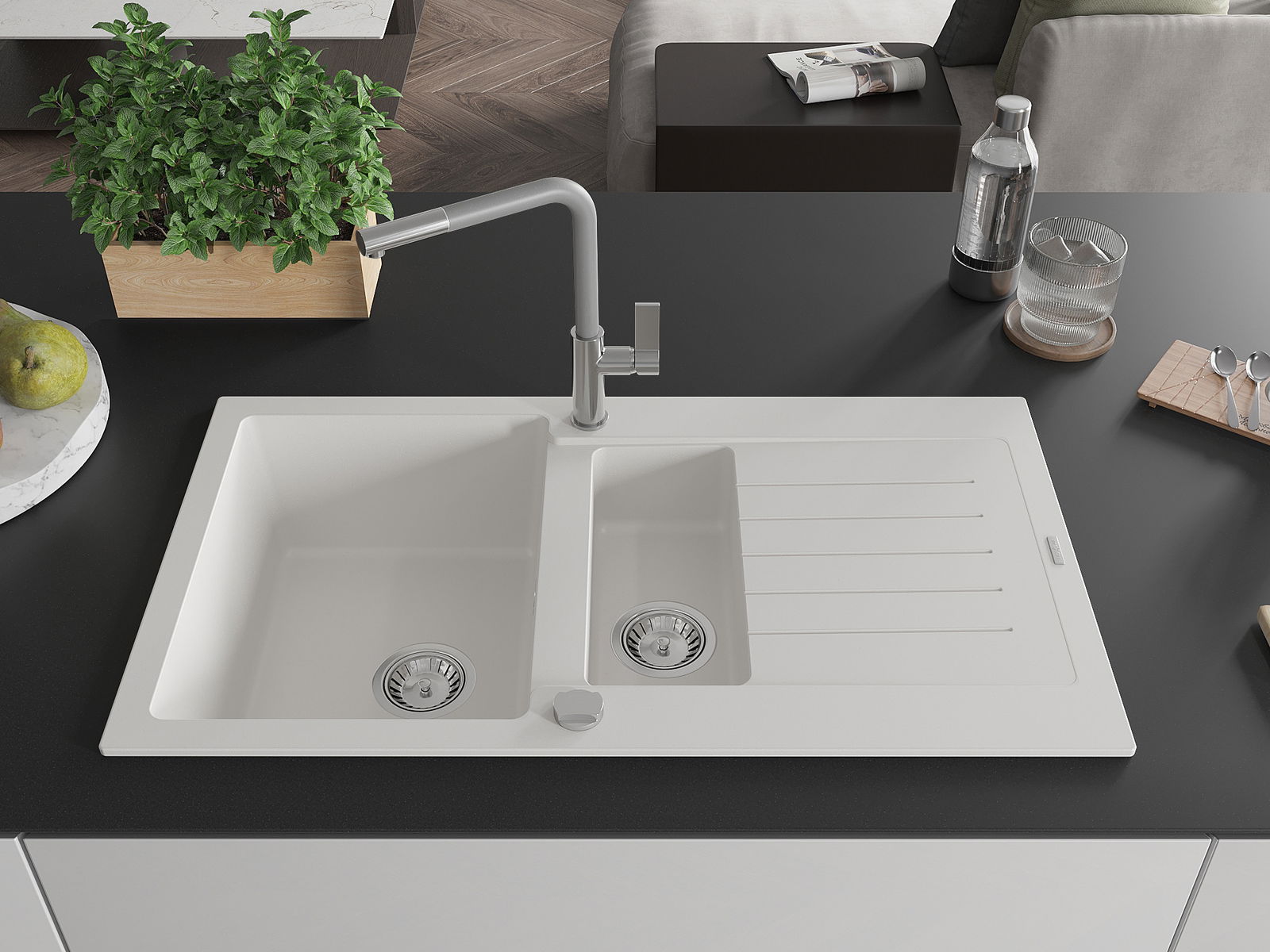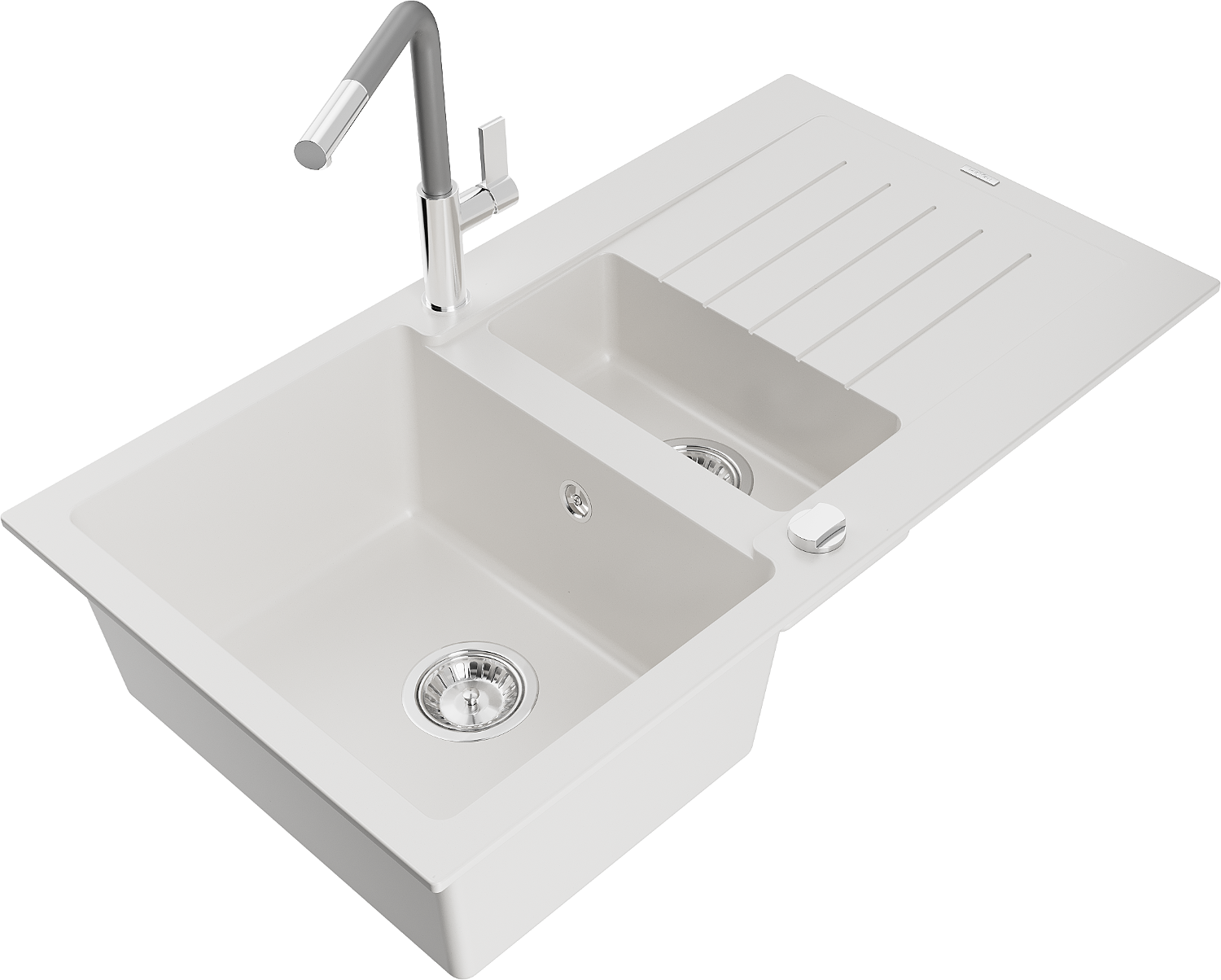 Mexen Matias gránit mosogató 1,5 medencés csepptálcával és Flora konyhai csapteleppel, fehér - 6502-20-670401-06