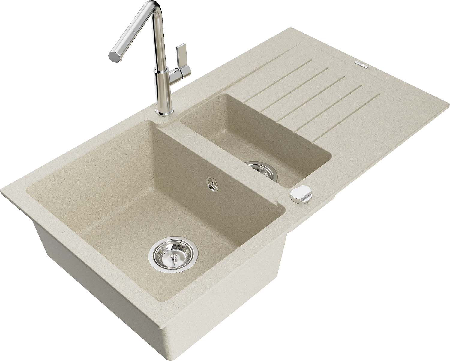 Mexen Matias gránit mosogató 1,5 medencés csepegtetővel és Flora konyhai csappal, bézs - 6502-69-670401-00