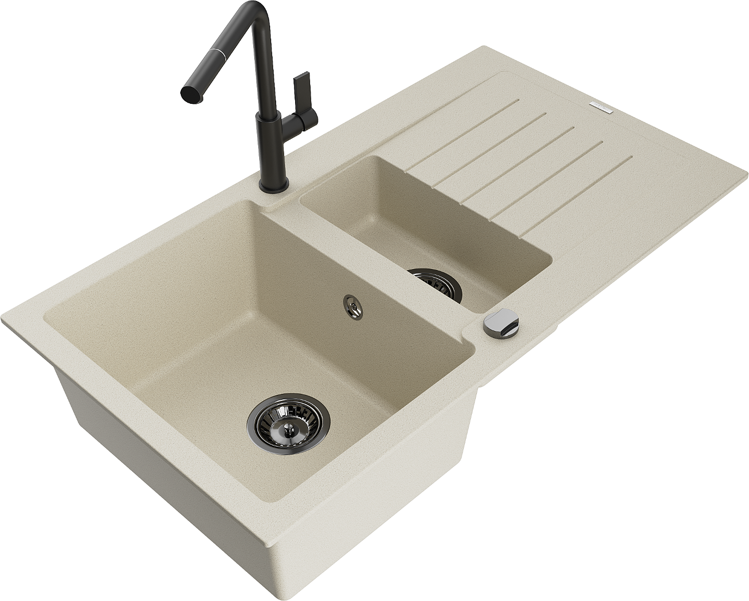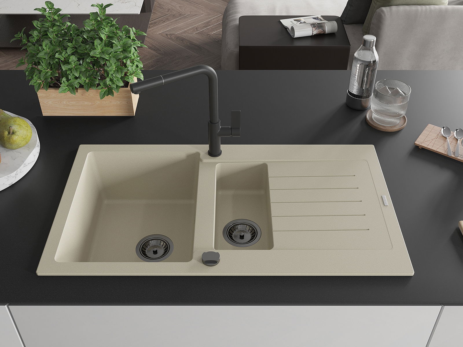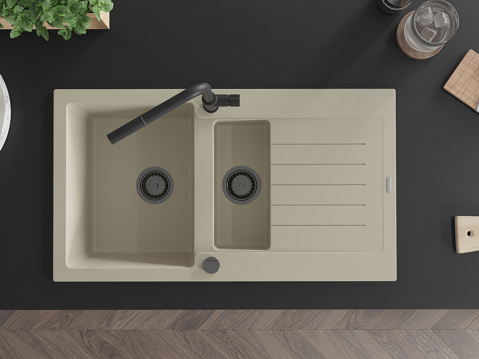 Mexen Matias gránit mosogató 1,5 medencés csepegtetővel és Flora konyhai csapteleppel, bézs - 6502-69-670401-70-B