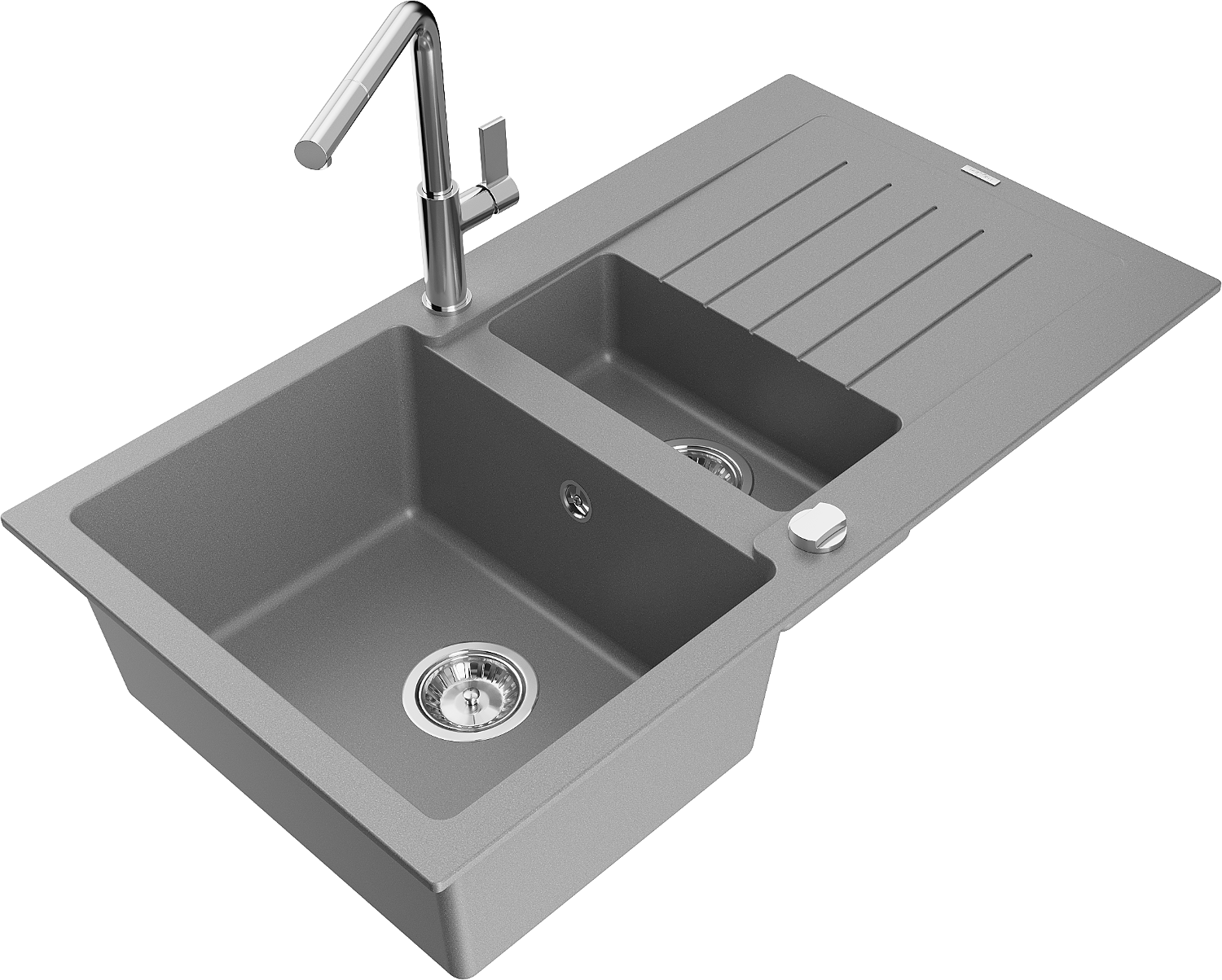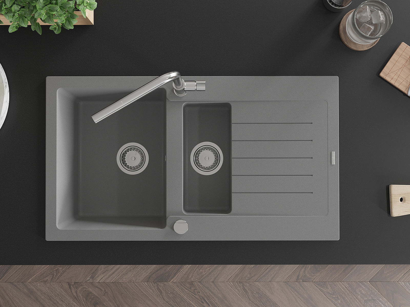 Mexen Matias 1,5 rekeszes gránit mosogató csepegtetővel és Flora konyhai csappal, szürke - 6502-71-670401-00