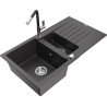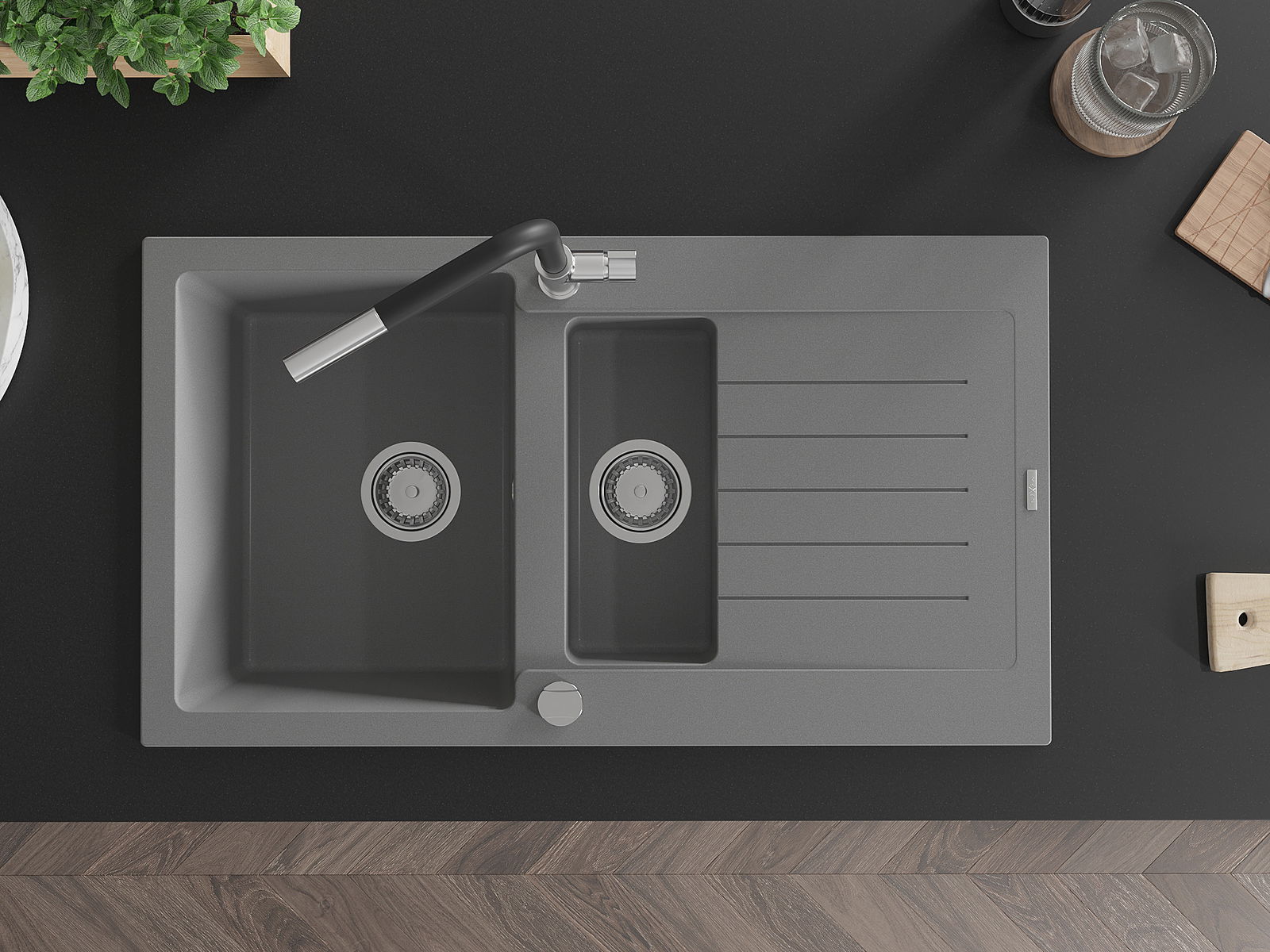 Mexen Matias gránit mosogató 1,5 medencés csepegővel és Flora konyhai csappal, szürke - 6502-71-670401-07