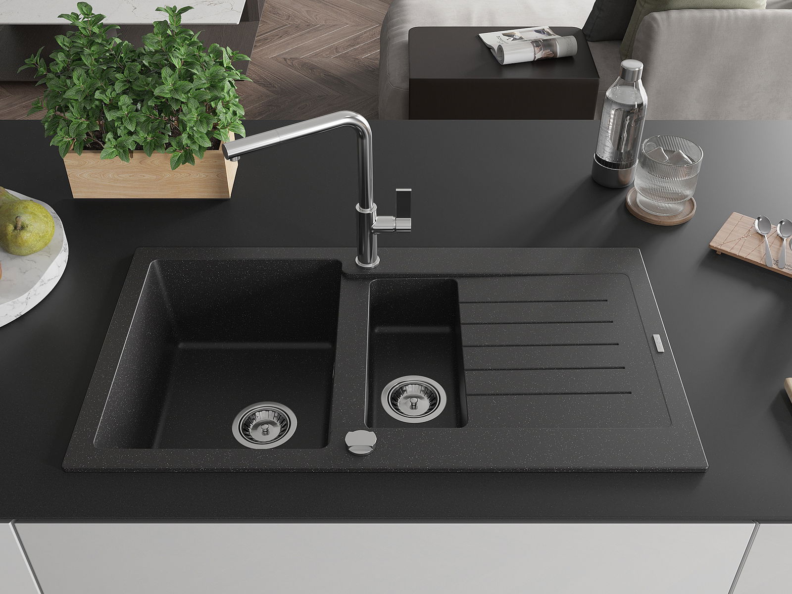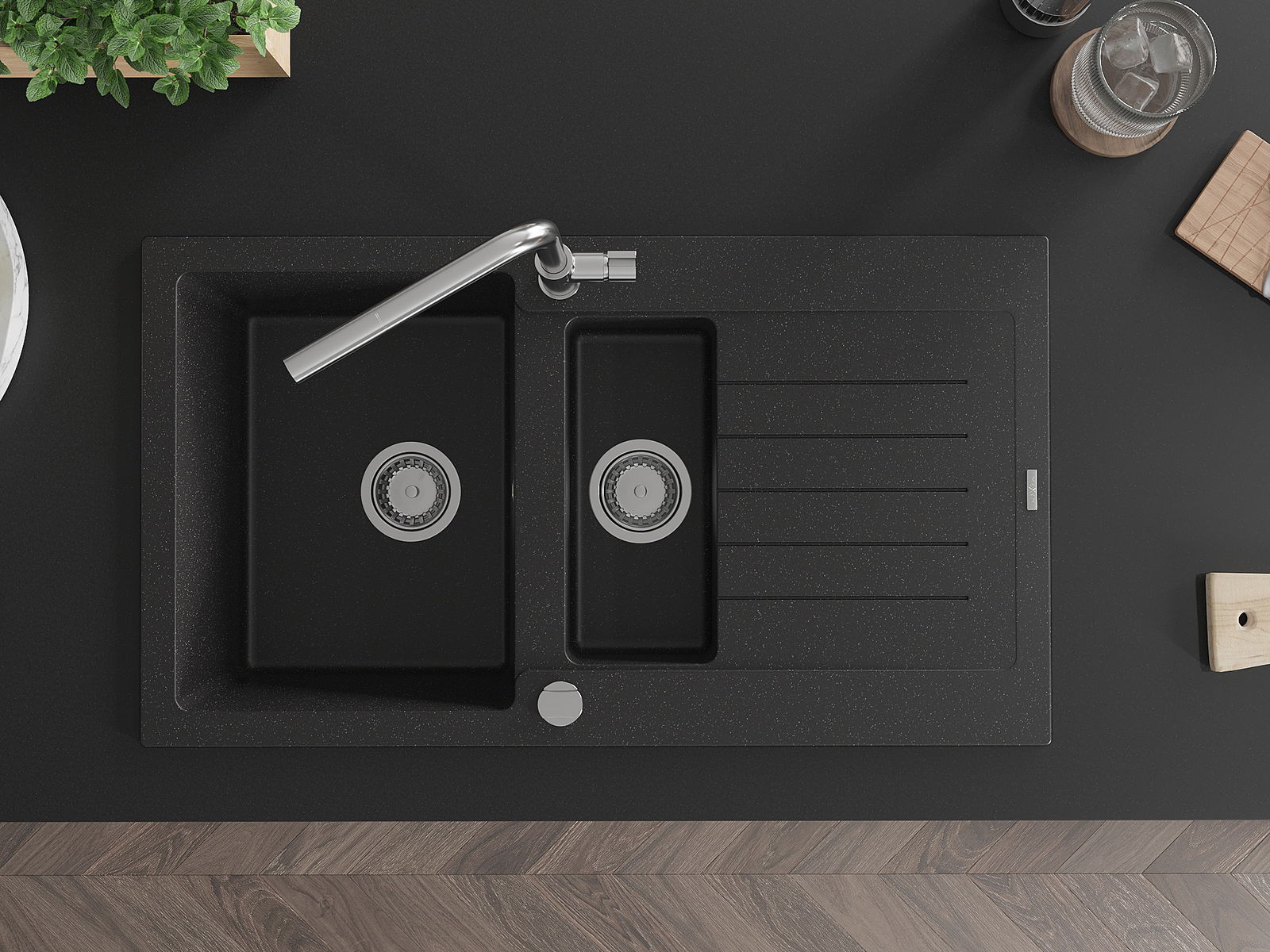 Mexen Matias 1,5 rekeszes gránit mosogató csepegtetővel és Flora konyhai csapteleppel, fekete/ezüst - 6502-73-670401-00