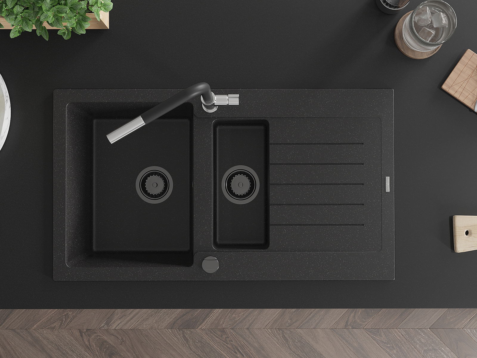 Mexen Matias gránit mosogató 1,5 medencével, csepegtetővel és Flora konyhai csapteleppel, fekete/ezüst - 6502-73-670401-07-B