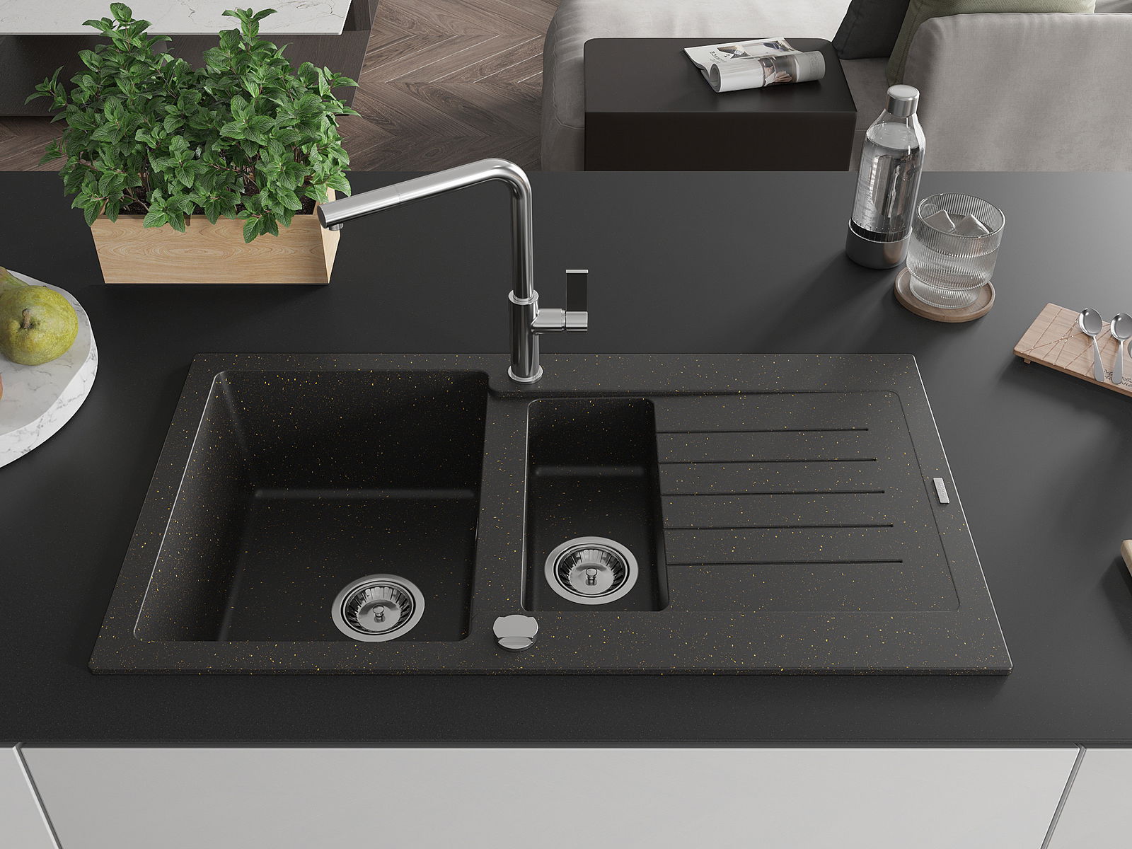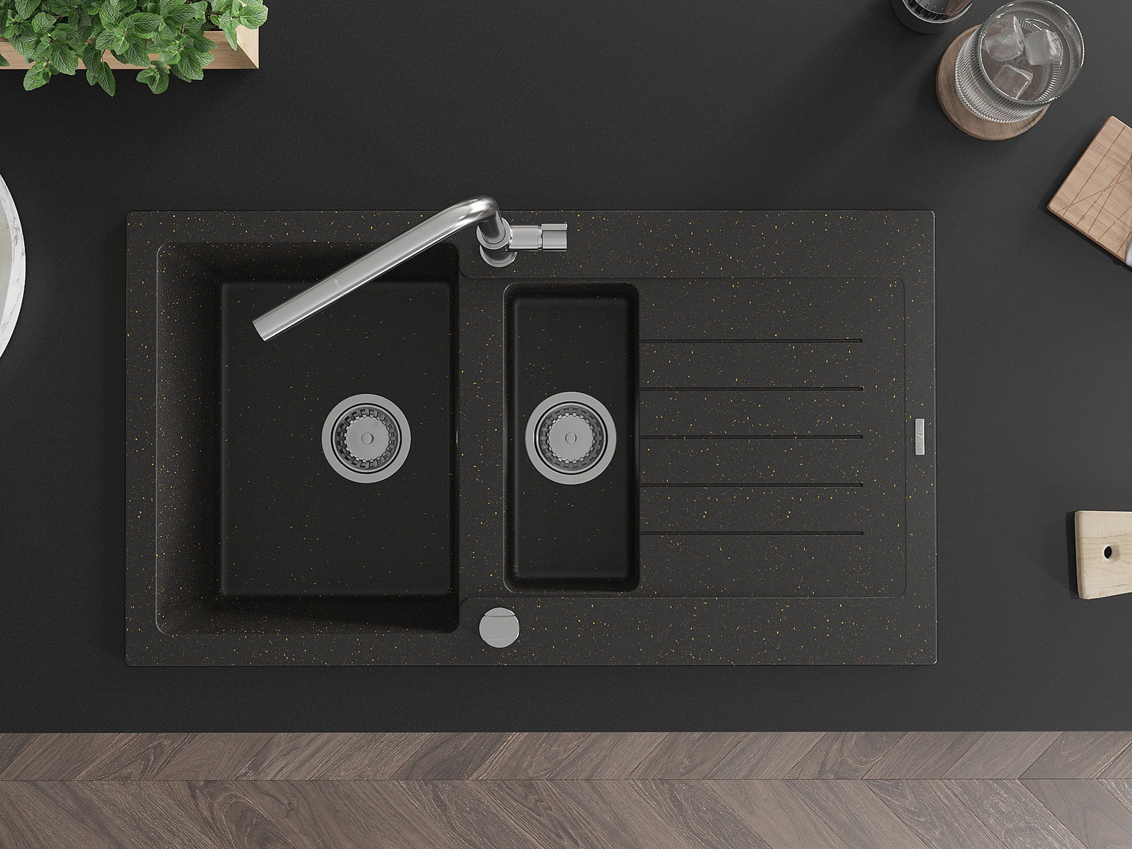 A mosogató 2 összekapcsolt lyukkal rendelkezik, amelynek átmérője 35 mm, önmagában. Felhasználhatók többek között Olyan folyékony adagoló rögzítéséhez, amely kiküszöböli a műanyag palackok jelenlétét a konyhában, és elegáns kivitelben adja meg.